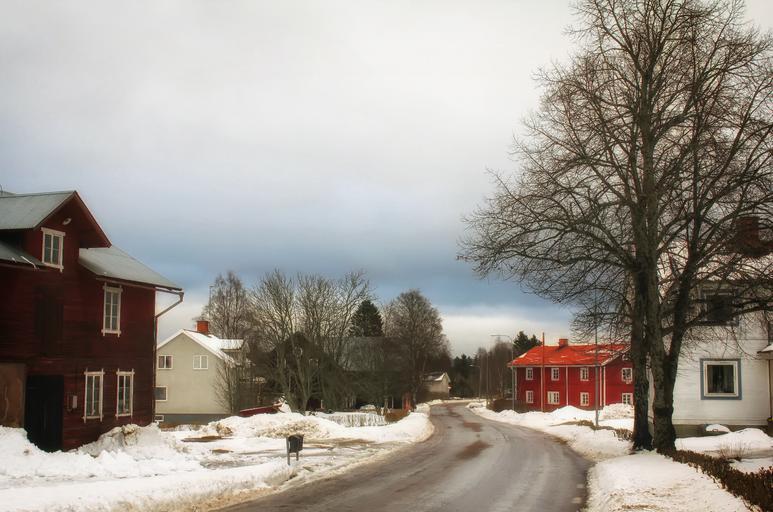 Keywords: enviken sweden village town houses homes winter street sky clouds