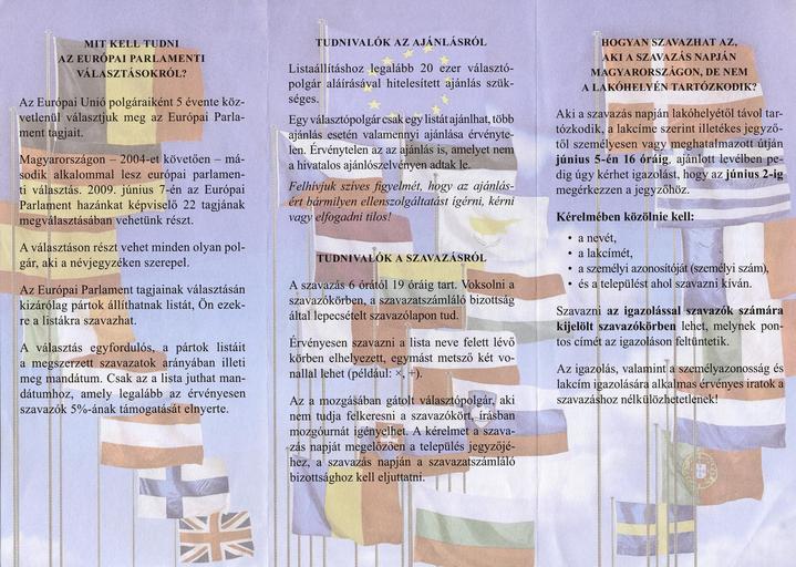 | Keywords: EP election 2009 in Hungary, Voter invitation card, face 2.jpg European Parliament election of 2009 This card has been delievered alongside with a proposal coupon in Hungarian kopogtatócédula or ajánlószelvény and a voter registration card for registered voters via letter Color 300 dpi Hardware Epson Perfection v10 hu Az Országos Választási Iroda szóróanyaga a 2009 évi európai parlamenti választásokhoz A választási névjegyzékre felvettek kapták kézhez az ajánlószelvénnyel és a névjegyzéki értesítővel együtt Színes 300 dpi Szkenner Epson Perfection v10 en Scanned by the uploader hu Saját szkennelés Hungary hu A szerző ismeretlen Közreadó http //www valasztas hu/ Az Országos Választási Iroda Publication 2009 PD-HU-exempt Frontpage only / Címlap Face 1 / Másik oldal Voter invitation cards European Parliament election 2009 Hungary |
