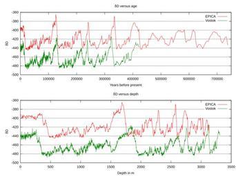 Keywords: EPICA delta D plot.svg Plots of delta-deuterium against age and depth from EPICA and Vostok Note that the Vostok core is deeper but does not extend as far back in time Note also that the y-axis offset between the EPICA and Vostok cores in delta-deuterium is real Vostok is a colder site hence has more negative delta Differences in the apparent age of events are likely to be inaccuracies in converting ice depth to age Epica_18_plot png 2010-06-20 12 20 UTC Epica_18_plot png NOAA derivative work Autopilot <span class signature-talk >talk</span> gnuplot Generated as svg Epica_18_plot png Data sets from ftp //ftp ncdc noaa gov/pub/data/paleo/icecore/antarctica/epica_domec/edc_dd txt ftp //ftp ncdc noaa gov/pub/data/paleo/icecore/antarctica/vostok/deutnat txt Generated with gnuplot <pre> unset multiplot set term svg size 1024 768 set output epica-18 svg set grid y set multiplot layout 2 1 set ylabel δD set title δD versus age set xlabel Years before present plot 0 750000 \ epica txt using 3 6 title EPICA with lines \ vostok txt using 2 3 title Vostok with lines set title δD versus depth set xlabel Depth in m plot \ epica txt using 1 6 title EPICA with lines \ vostok txt using 1 3 title Vostok with lines </pre> PD-USGov original upload log This image is a derivative work of the following images File Epica_18_plot png licensed with PD-USGov 2008-05-24T15 30 59Z Rosarinagazo 596x417 11279 Bytes <nowiki> Plots of delta-deuterium against age and depth from EPICA and Vostok Note that the Vostok core is deeper but does not extend as far back in time Note also that the y-axis offset between the EPI</nowiki> Uploaded with derivativeFX Climatological diagrams Deuterium Glaciers of Antarctica Glaciological diagrams Neogene |