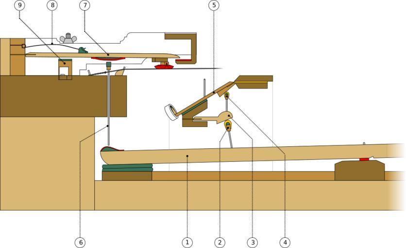 Keywords: Erard double pilot action.svg Mécanisme à pilote mécanisme des premiers pianos à trois cordes fabriqués vers 1790 par les frères Erard traced colorized and reoriented for right hand view by Mireut from plate III - Perfectionnemens apportés dans le mécanisme du piano par les Erard depuis l'origine de cet instrument jusqu'à l'exposition de 1834 Pierre Erard Paris 1834 http //www musiques-vivantes com/index php option com_content task view id 57 Itemid 32 1834 Pierre Erard key 1 <br />jack 2 <br />false hammer or intermediate lever underhammer 3 <br />second jack 4 <br />hammer 5 <br />damper stick lift rod 6 <br />damper 7 <br />damper spring 8 <br />portion of the mechanism for raising the damper 9 1 鍵 2 ジャック 3 フォルス・ハンマー(中間レバー) 4 セカンド・ジャック 5 ハンマー 6 ンパー・スティック(リフト・ロッド) 7 ンパー 8 ンパー・スプリング 9 ンパーを持ち上げる機構 PD-old Musical instruments schemes Musical instruments technical diagrams Piano action Diagrams labelled with numbers only SVG music Sébastien Érard Pianos by Érard |