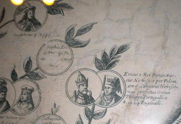 Keywords: Eric & Philippa of Denmark, Norway & Sweden print (very old) 2010.jpg en Old print in Darłowo Castle with genealogical information about King Eric the Pomeranian of Scandinavia as released by image creator Ristesson;<br>Place Darłowo Poland User EmilEikS/Template Southerly Clubs Jacob Truedson Demitz for Ristesson 2010-10-23 Ristesson History Darłowo Castle Eric of Pomerania Philippa of England Images by Jacob Truedson Demitz Lars E J Ridderstedt; Lars Jacob |