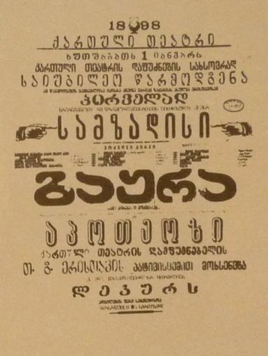 Keywords: Eristavi's play poster.jpg en Poster of Giorgi Eristavi's play The Family Settlement ka აფიშა გი რგი ერისთავის პიესისა გაყრა http //burusi files wordpress com/2009/12/copy-of-copy-of-p1030414 jpg unknown Giorgi Eristavi 1813-1864 1898 PD-old PD-RusEmpire Giorgi Eristavi 1898 in Georgia Mkhedruli book covers |