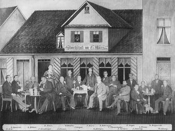 Keywords: Erlangen Marxei um 1910 001.JPG Erlangen Verein Die Gemüthlichen vor dem Gasthaus Marxei in der Schuhstraße 4-6 Zeichnung von Hans Barthelmeß mit montierten Fotografien Scan aus dem Buch Christoph Friedrich Bertold Frhr von Haller und Andreas Jakob Erlanger Stadtlexikon W Tümmels Verlag Nürnberg 2002 ISBN 3-921590-89-2 Hans Barthelmeß ~ 1910 PD-old History of Erlangen Bavaria in the 1910s Black and white photomontages of people Black and white photographs of groups Black and white photographs |