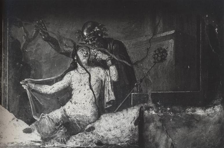 Keywords: Ermafrodito e Sileno, Casa dei Vettii, Pompei.jpg it Sala q parete ovest nel tratto al di sopra della porta verso l'ambiente r in uno spazio condizionato dalla presenza del varco così che il quadro è più lungo nella metà su periore si trova un'altra rap presentazione di Ermafrodito questa volta circuito da Sileno che gli sta alle spalle con una clamide rossa che copre il cor po fortemente abbronzato e che contrasta con il suo femmineo e bianchissimo Ermafrodito adorno di collana e brac ciali sollevando il lembo del manto che in parte gli copre le gambe e il dorso mostra al Sileno il membro eretto e con la sinistra afferra la barba del vecchio che sembra fermarlo trattenendogli il polso mentre la destra sollevata ed aperta ne rivela la meraviglia dinanzi alla scoperta della ambigua natura del giovane androgino Un tirso è appoggiato a destra e sullo sfondo è accennato il podio di un edificio en Hall q west wall in the section above the door to the environment r in an area affected by the presence of the gap so that the picture is longer in the upper half on there is another RAP of Hermaphroditus this time from Silenus circuit that is behind with a red robe that covers his heart while heavily tanned and contrasts with his feminine and very white Hermaphroditus and a necklace adorned cial arm lifting the hem of the mantle that partially covers the legs and the back to show the erect member and Silenus with the left upright and grabs the old man's beard seems to stop holding the wrist while the right raised and opened to reveal the wonder before the discovery of the ambiguous nature of the young androgynous A thyrsus is supported right and the background is mentioned on the podium of a building 1990 http //pompeii uark edu/digipomp/browse cgi do image_detail ImageID 281 t Digital Pompeii Project <gallery>File Pompeii - Hermaphroditus and Silenus jpg Museo Archeologico Napoli </gallery> Custom license marker 2012 04 18 PD-Art Uploaded with UploadWizard Androgyny in ancient art Hermaphroditus and Silenus Ancient Roman erotic frescos in the House of the Vettii Pompeii |