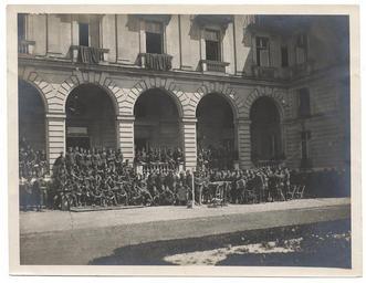 Keywords: smithsonian institution smithsonianinstitution 1915 military uniform militaryuniform group photograph groupphotograph aef training center aeftrainingcenter bellevue france bellevuefrance servicemen europe ww1 archives of american art archivesofamericanart outdoor Description: Group of men in military uniform in front of a school where Peixotto taught. Identification on verso (handwritten): The Students and the School; Ernest Peixotto. Peixotto, Ernest, 1869-1940 Creator/Photographer: Unidentified photographer Medium: Black and white photographic print Dimensions: 17 cm x 22 cm Date: c. 1915 Persistent URL: www.aaa.si.edu/collections/images/detail/ernest-peixotto-... Repository: Archives of American Art Collection: Charles Scribner's Sons Art Reference Department Records, c. 1865-1957 Accession number: aaa_charscrs_4325 Description: Group of men in military uniform in front of a school where Peixotto taught. Identification on verso (handwritten): The Students and the School; Ernest Peixotto. Peixotto, Ernest, 1869-1940 Creator/Photographer: Unidentified photographer Medium: Black and white photographic print Dimensions: 17 cm x 22 cm Date: c. 1915 Persistent URL: www.aaa.si.edu/collections/images/detail/ernest-peixotto-... Repository: Archives of American Art Collection: Charles Scribner's Sons Art Reference Department Records, c. 1865-1957 Accession number: aaa_charscrs_4325