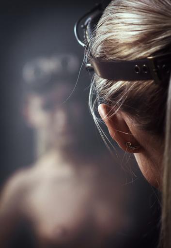 Keywords: erotica steampunk reflection mirror goggly girl model ear breast