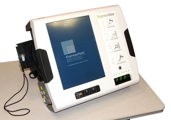 | Keywords: ES&S Express Vote.jpg Optical scan voting system Electronic ballot marker electronic ballot marker the ExpressVote made by Election Systems Software This prints an narrow paper ballot containing a summary of votes cast in both human-readable and bar code form for input to an 0ptical scan voting system Voters using the touch screen see an interface similar to a DRE voting machine while voters with disabilities may use a variety of assistive device s including audio output and the tactile keyboard tucked into the right side of the machine 2016-08-09 10 51 47 own Douglas W Jones other versions cc-zero Voting machines Location not applicable Ballot marking devices |