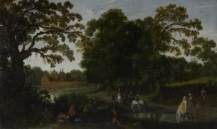 Keywords: Esaias van de Velde I - Courtly Procession before Abstpoel Castle - 83.122 - Minneapolis Institute of Arts.jpg Courtly procession on a tree-lined road moated castle in left distance Large coulisse tree in left foreground open hillside before woods beyond at right Man in center foreground standing on his head The work depicts Margaretha van Mechelen riding out with Prince Maurits near Abspoel House in the vicinity of Oegstgeest 40 x 68in 101 6 x 172 7cm 40 x 67 1/4 in 101 6 x 170 82 cm sight 51 1/2 x 79 x 2 3/4 in 130 81 x 200 66 x 6 99 cm outer frame 83 122 https //api artsmia org/images/3148/6798/large jpg Q1700481 Oil on canvas Probably Margaretha van Mechelen Abtspoel Castle; by descent to her son Lodewijk;1 descended to Heer van Beverweerd; by descent to his wife Hester van Foreest; Van Foreest family Nijenburg Castle Heiloo until 1954 Gallery Nicolaas Beets b 1878 Amsterdam The Netherlands by 1954 Jacob Theodor Cremer d 1979 Duin Kruidberg Santpoort The Netherlands; Cremer sale through Sotheby's and Mak van Waay Amsterdam The Netherlands November 17 1980 lot 10 ;2 purchased for joint ownership by Gallery Gebr Douwes Amsterdam The Netherlands and the Artemis Group London ; sold to MIA in 1983 1 For religious reasons Prince Maurice and Margaretha van Mechelen could not marry however they did have a son 2 Copy of catalogue in curatorial file Courtly Procession before Abstpoel Castle https //collections artsmia org/index php page detail id 3148 Q20891276 Esaias van de Velde Maurice of Nassau Louis of Nassau-Beverweerd |
