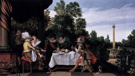 Keywords: Esaias van de Velde 006.jpg Artwork Creator Esaias van de Velde LangSwitch Fröhliche Gesellschaft auf einer Gartenterrasse Merry company banqueting on a terrace <ref>http //www wga hu/html/v/velde2/esaias/merrycom html Web Gallery of Art </ref> ca 1615 oil on canvas size cm 43 77 Institution Gemäldegalerie Berlin object history ProvenanceEvent 1918 acquisition LangSwitch von die the la de Gemäldegalerie Berlin credit line E V de V / 16 traces of signature and date bottom right accession number 1838 WGA link 24503 http //www wga hu/art/v/velde2/esaias/merrycom jpg http //www wga hu/html/v/velde2/esaias/merrycom html painting genre Dutch 1601-1650 PD-old-100 LangSwitch Notes Noten <references /> Esaias van de Velde 1615 1610s paintings in Berlin Dutch Golden Age paintings in the Gemäldegalerie Berlin Velde Esaias van de WGA form painting WGA type genre WGA School Dutch WGA time period 1601-1650 17th-century oil on canvas paintings in Germany Eating in paintings 1615 paintings in Germany Group paintings of people at outdoor tables Merry company paintings |