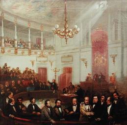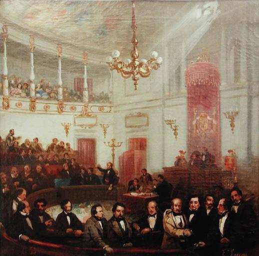 Keywords: Escena congreso de los diputados siglo XIX Eugenio Lucas Velázquez.jpg El lienzo representa el desarrollo de un acto parlamentario en el Salón de Sesiones del Congreso de los Diputados de España a mediados del siglo XIX Circa 1854-1855 oil canvas Size cm Institution Palacio de las Cortes Madrid object history exhibition history credit line accession number http //narros congreso es/visitanueva/fondos jsp fm 1 fc 1 mp 3 PD-old-100 Eugenio Lucas Velázquez Paintings in the Palacio de las Cortes Spain in the 1850s Politics in art |