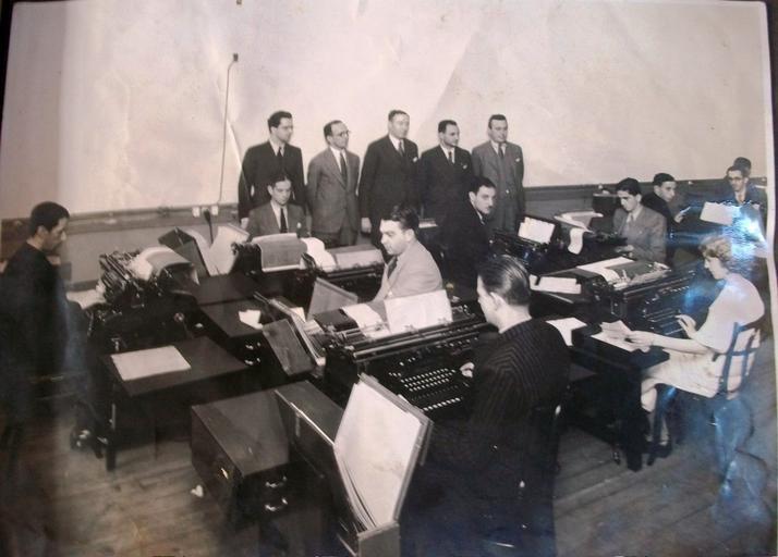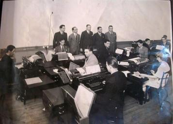| Keywords: Escritório Matarazzo.jpg Escritório do Conde Matarazzo por volta de 1930 Em pé estão Salvador Graciano Cappellano contador seu concunhado Luís Lulu Coccozza advogado e outros own ~ 1930 original photo / Luiz Carlos Cappellano repro Black and white photographs People with typewriters People of Brazil 1930 photographs PD-old |