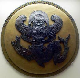 Keywords: Escudo olimpia.jpg en Shield depicting a winged gorgon with the tail of a fish and lion feet 2nd half of the 6th century B C Archaeological Museum of Olympia es Escudo con una gorgona alada con cola de pez y piernas de león Segunda mitad del siglo VI a C Museo Arqueológico de Olimpia fr Episème en bronze d'un bouclier votif décor au repoussé Gorgone ailée avec des pattes de lion et une queue de poisson 2ème moitié du VIe siècle avant J C pt-br Episema um bronze de um escudo votivo decorado em repoussé Górgona alada com patas de leão e cauda de um peixe Segunda metade do século VI antes de J C Museu Arqueológico de Olímpia own Nanosanchez 2009-04 Olympia B 4990 |