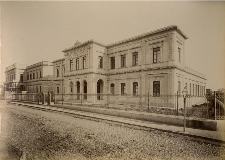 Keywords: Escuela Elemental de Niñas (Boote, 1889).jpg es Edificio escolar de dos plantas construido sobre la calle Caridad actual General Urquiza esquina Alsina actual Escuela General Zapiola Un friso sobre el primer piso identifica el establecimiento Escuela Elemental de Niñas Hacia la izquierda el edificio escolar todavía se encuentra en la etapa de construcción Escuela Mariano Acosta mostrando pilas de ladrillos y andamios varios Se encuentra rodeado por una reja perimetral de hierro ; sobre la vereda de la calle Caridad se ubica un farol de iluminación nocturna y la calle de empedrado irregular muestra las vías de una linea de tranvías a caballo Fotografía Samuel Boote Vistas de Escuelas Comunes Consejo Nacional de Educación 1889 PD-AR-Photo Schools in Buenos Aires Built in Argentina in 1888 Balvanera Buenos Aires Italianate architecture in Argentina Samuel Boote |