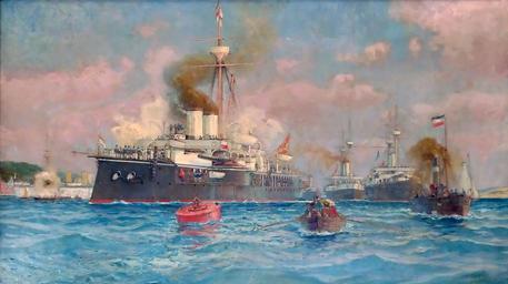 Keywords: Eskadermanöver in Kiel (Alexander Kirchner, 1890).jpg en Squadron drill of SMS Kronprinz Erzherzog Rudolf SMS Kronprinzessin Erzherzogin Stephanie SMS Kaiser Franz Joseph I and SMS Tiger at Kiel oil on canvas de K u K Eskader bestehend aus den Schiffen Kronprinz Erzherzog Rudolf Kronprinzessin Erzherzogin Stephanie Kaiser Franz Joseph I und Tiger anlässlich der deutschen Flottenmanöver im Jahre 1890 in Kiel Öl auf Leinwand own Creator Alexander Kircher 1890 Note color-corrected photograph may not exactly reflect original color Kronprinz class battleship Alexander Kircher PD-old-auto 1939 |