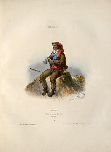 Keywords: Espagne - Aragon - Pastor en la altas Montañas = Berger - Fonds Ancely - B315556101 A GAVARNI 2 024.jpg Suite de 24 lithographies coloriées avec légende en français et en espagnol numérotées de 1 à 24 couverture lithographiée portant une vignette en noir Montaneses de la frontera de Francia Très rare oeuvre de jeunesse de Gavarni Les pl ne sont pas signées elles portent la mention lith de Lemercier en bas à droite et les deux adresses de Rittner Epreuves en coloris de l'époque sous une couverture de livraison Il existe des tirages avant la lettre non coloriés Pièces jointes extrait du catalogue de la vente de la Bibliothèque de Bonnelles 1933 et couvertures en doublet et en feuilles de l'album Gavarni Ancely René 1876 - 1966 Possesseur fre spa public domain domaine public B315556101_A_GAVARNI_2_024 jpg image/jpeg 1 pl en coul non signée ; 29 cm Lemercier Alfred Léon 18 -18 ; lithographe Lithographe Rittner Henri 1802-1840 ; éditeur Editeur http //numerique bibliotheque toulouse fr/collect/general/index/assoc//ark /74899/B315556101_A_GAVARNI_2_024 dir/B315556101_A_GAVARNI_2_024 jpg Bibliothèque municipale de Toulouse A-GAVARNI 2-21 Creator Paul Gavarni http //catalogues toulouse fr/web2/tramp2 exe/do_keyword_search/log_in setting_key BMT1 servers 1home query p000530 vignette http //numerique bibliotheque toulouse fr/collect/general/index/assoc//ark /74899/B315556101_A_GAVARNI_2_024 dir/B315556101_A_GAVARNI_2_024_thumb jpeg 1829 Espagne - Aragon - Pastor en la altas Montañas Berger B315556101_A_GAVARNI_2_024 print - colors - color lithograph History of clothing Vests Needlework History of Pyrénées Province of Huesca Shepherds in Spain Sitting people in art National costumes in art Rocks in art Hiking equipment Men in art Jackets People with tuques in art Paul Gavarni |
