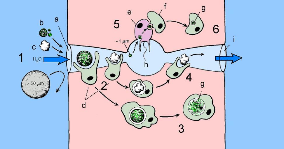 | Keywords: Esponjas alimentacion.jpg Alimentación de las esponjas Commons Ishrana PNG 10-III-07 X Vázquez PD Ishrana PNG Español Esquema de la alimentación de las esponjas 1 el agua cargada de partículas penetra por los poros; 2 las partículas grandes son fagocitadas por los aqueocitos; 3 las partículas orgánicas son digeridas intracelularmente por los arqueocitos; 4 las partículas inorgánicas como granos de arena son expulsadas en el canal exhalante; 5 las partículas pequeñas penetran en la cámara vibrátil y son fagocitadas por los coanocitos que las transfieren a los arqueocitos; 6 las partículas son digeridas intracelularmente por los arqueocitos a poro inhalante; b partículas orgánicas; c partícula inorgánica; d arqueocitos; e coanocito; f arqueocito; g vacuola digestiva Xvazquez Porifera diagrams |