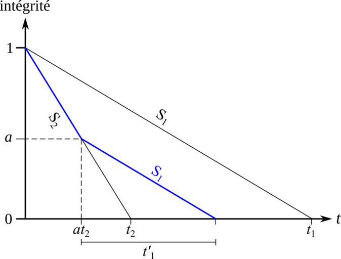 Keywords: Essais dommages cumules.svg en Accelerated failure test with the method of damage cumulation a sample under a stress level S<sub>i</sub> fails at a time t<sub>i</sub> with S<sub>2</sub> > S<sub>1</sub>; a test is performed under a stress level S<sub>2</sub> during at<sub>2</sub> 0 < a < 1 then after a stress level S<sub>1</sub>; the failure occurs at t<nowiki>'</nowiki><sub>1</sub> Hypothesis the damage cumulate linearly It can be represented by an integrity level which ranges from 1 no damage to 0 failure and which decreases linearly for a given stress level fr Essai de défaillance accéléré avec la méthode des domages cumulés un échantillon soumis à un niveau de contrainte S<sub>i</sub> présente une défaillance après un temps t<sub>i</sub> avec S<sub>2</sub> > S<sub>1</sub> ; on effectue un test avec une contrainte S<sub>2</sub> pendant un temps at<sub>2</sub> 0 < a < 1 puis avec une contrainte S<sub>1</sub> ; la défaillance survient à l'instant t<nowiki>'</nowiki><sub>1</sub> Hypothèse les dommages se cumulent linéairement On peut représernter cela par un niveau d'intégrité qui va de 1 pas de dommage à 0 défaillance et qui décroît de manière linéaire pour un niveau de contrainte donné 2012-06-11 own Cdang inkscape cc-zero Uploaded with UploadWizard Reliability |