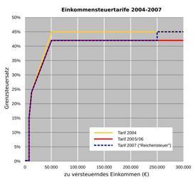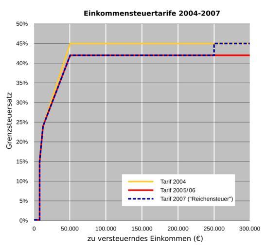 Keywords: ESt-Tarife04-07-v3.svg Einkommensteuertarife Deutschland 2004-2007 Selbst erstellt mit Informationen des BMJ und BMF 2006-06-15 cktu de Reichensteuer cktu Reworked version of de Image ESt-Tarife04-07-v2 svg by Sioux and xavax Tax in Germany |