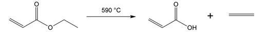 | Keywords: Ester pyrolysis.png Chemical structure of w Ester_pyrolysis w ethyl acrylate decomposes into w acrylic acid and w ethene gas at 590 C Own 2007-09-22 shoyrudude555 Public domain Comments High-resolution black/white PNG made with ChemSketch and Photoshop ” see WikiProject Chemistry - structure drawing for detailed instructions Please drop me a note if you need the source file Ethyl acrylate Acrylic acid Elimination reactions Pyrolysis | ||||