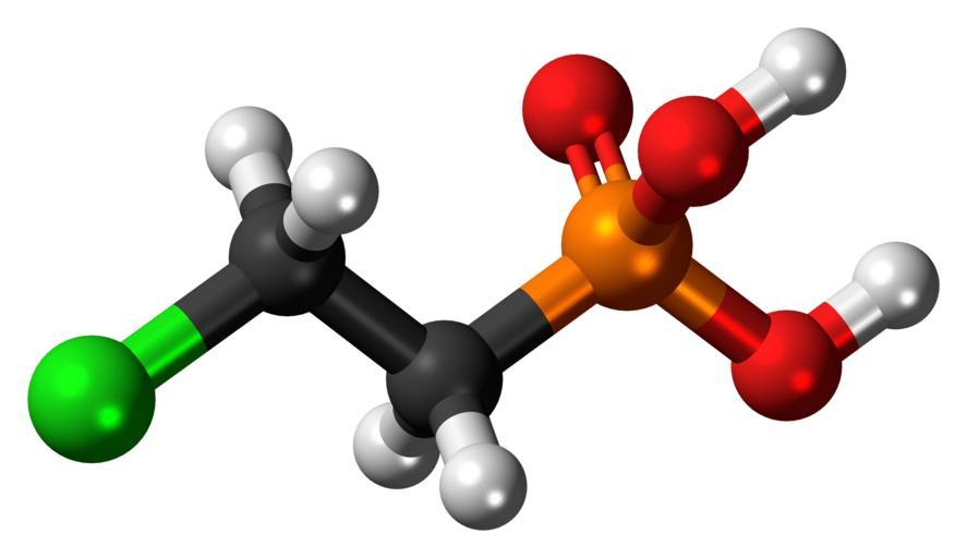Keywords: Ethephon-3D-balls.png Ball-and-stick model of the ethephon molecule the most widely used plant growth regulator Colour code 505050 Carbon C black<br> F0F0F0 Hydrogen H white<br> F51E1E Oxygen O red<br> FA8C00 Phosphorus P orange<br> 14F014 Green Chlorine Cl<br> 2011-06-11 own DS Visualizer Jynto talk Space-filling version cc-zero Phosphonic acids Organochlorides Ball-and-stick models Images by Jynto |