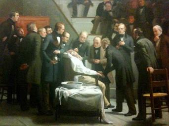 Keywords: Ether Day, or The First Operation with Ether by Robert C. Hinckley.jpg accession number creator Robert C Hinckley 1882-1893 96 x 115 Francis A Countway Library of Medicine Harvard University oil on canvas http //www health harvard edu/blog/painkillers-and-drug-addiction-an-ongoing-dilemma-20101027677/ether en People in the painting left to right 1 Newspaper reporter 2 John Call Dalton 3 William Williamson Wellington 4 Abel Lawrence Peirson 5 Charles Hosea hildreth 6 William Thomas Green Morton 7 Jonathan Mason Warren 8 Gilbert Abbott 9 John Collins Warren 10 Eben H Frost 11 Charles Frederick Heywood 12 Henery Jacob Bigelow 13 Augustus Addison Gould 14 Solomon Davis Townsend Source http //neurosurgery mgh harvard edu/History/hinkley htm 1882-1893 http //www health harvard edu/blog/painkillers-and-drug-addiction-an-ongoing-dilemma-20101027677/ether Robert C Hinckley 1853-1941 other versions PD-Art Robert C Hinckley Ether Day 19th-century medicine in painting Harvard Medical School |