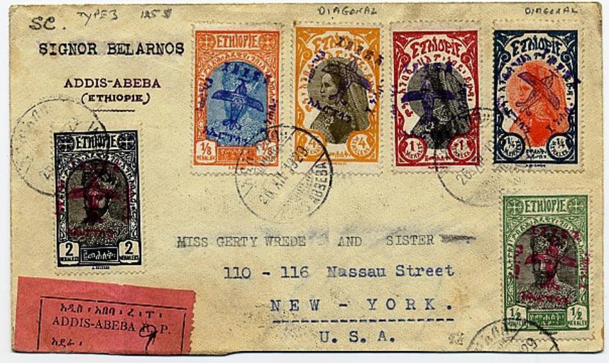 MAKE A MEME View Large Image EthiopiaFirstFlightCover1929.jpg en Ethiopia registered first flight cover posted December 26 1929 from Addis-Ababa to New York franked with Ethiopian air mail stamps C1-6 all Type III two values with diagonal overprints The cover is cut at ...