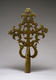 Keywords: Ethiopian - Processional Cross - Walters 542891.jpg The complicated design of this cross must have presented a considerable challenge to its creator who cast its body in one piece Simple incised borders sharpen and distinguish the individual components of the object These lines which were probably added freehand provide a texture that animates the surface of the entire cross The numerous perforations create an intricate silhouette but also serve the practical function of conserving material and minimizing weight The shaft perhaps a later edition was riveted to the base The foliate decoration of the cross which simultaneously suggests birds and vegetation creates a complex pattern around the small cross at the center In Ethiopian art birds often serve as heralds of the Resurrection and their evocation here is therefore appropriate The multiple projections further strengthen the allusion to the rejuvenating power of the cross as their tendril-like repetition conveys a sense of organic growth The additional presence of three smaller crosses at the terminal points of the object reiterates this idea; the crosses spring like young buds from their supporting extensions century 12 13 Solomonic cast bronze cm 25 4 19 19 accession number 54 2891 34875 Knopfelmacher Collection Knopfelmacher 8 New York William Wright Gallery New York Walters Art Museum 1996 by purchase Museum purchase with funds provided by the W Alton Jones Foundation Acquisition Fund 1996 Ethiopian Art at The Walters The Walters Art Gallery Baltimore 1996 Angels of Light Ethiopian Art from the Walters Art Museum Birmingham Museum of Art Birmingham; Smith College Museum of Art Northampton; Museum of Biblical Art New York 2006-2007 place of origin Lasta Ethiopia Walters Art Museum license Art of Ethiopia in the Walters Art Museum Crosses from Ethiopia Media contributed by the Walters Art Museum needs category review |