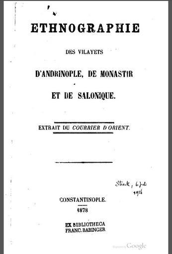 Keywords: Ethnographie des Vilayets d'Andrinople, de Monastir et de Salonique (1878), εξώφυλλο.jpg el Το εξώφυλλο του έργου του Βούλγαρου ητρο ολίτη της Στάρα Ζαγκόρα ετόντι Κούσεφ Ethnographie des Vilayets d'Andrinople de Monastir et de Salonique en The cover of the work of the Bulgarian Bishop of Stara Zagora Metodi Kusev Ethnographie des Vilayets d'Andrinople de Monastir et de Salonique 1878 Ethnographie des Vilayets d'Andrinople de Monastir et de Salonique етодий Кусев other versions PD-old-70-1923 Uploaded with UploadWizard Uncategorized 2015 July 13 |