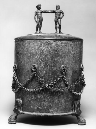 | Keywords: Etruscan - Cista Depicting an Assembly of Warriors - Walters 54134.jpg Cistae were containers used to safeguard precious objects including mirrors perfume flasks and cosmetics A particular type of cista was made during the 4th and 3rd centuries BC in Praeneste a site in Latium the region around Rome that was heavily influenced by Etruscan culture The elaborately engraved scenes are thought to imitate famous but now lost Greek wall-paintings The ancient metalworker often pressed a white substance into the engraved lines in order to accentuate the decoration The handles commonly take the form of human figures Many artists in other early Italian cultures similarly incorporated figures of humans in functional objects A scene of warriors assembled within a large palace or hall is a common decoration on cistae On the front at left are two running figures carrying shields; an eagle flies over the left figure Three helmeted warriors appear to the right On the back is a seated young man his armor gathered around him and a horse at ready nearby A satyr and a maenad with their arms intertwined form the lid's handle The vessel's feet have the four toes of a lion but are shaped like a bird's claws; each is topped by winged youth century 4 3 BC bronze cm 41 24 5 accession number 54 134 28925 Don Marcello Massarenti Collection Rome date and mode of acquisition unknown Henry Walters city Baltimore Walters Art Museum Henry Walters Acquired by Henry Walters with the Massarenti Collection 1902 place of origin Latium in present-day Italy Walters Art Museum license Etruscan art in the Walters Art Museum Cistae Etruscan bronzes from Italy Media contributed by the Walters Art Museum needs category review |