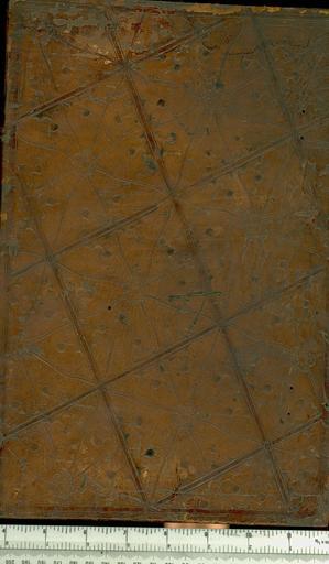Keywords: Etymologiae--Augsburg-- Günther Zainer, 19 Nov. 1472- - Lower cover (I.B.5441).jpg Style Single tools design All over design Lozenge or diamond; Caption Lower cover; Colour Brown; Edge Title in ink on top edge exhibition history Decorative Technique Tooled in blind; Cover Material Goatskin includes morocco turkey etc Wooden boards Traces of 2 pairs of clasps Goff I181; H 9273 ;BMC II 317 Some tools similar to Salzburg St Peter IV Meister des Johann Walgungsberger Walgungsberger-Meister Ink ms notes; object history Text 1472; Augsburg; Scheyern Benedictine Abbey object type Cc-zero place of creation Binding Germany place of discovery Unspecified British Library image http //www bl uk/catalogues/bookbindings/LargeImage aspx RecordId 020-000014817 ImageId ImageId 54233 Copyright BL Etymologiae Augsburg Günther Zainer 19 Nov 1472 Uploaded with GWToolset Etymologiae Augsburg Günther Zainer 19 Nov 1472 - Lower cover I B 5441 http //www webarchive org uk/bldatasets/bindings/ib5441L jpg Bookbinding 15th-century bookbinding British Library Bookbindings Scanned with HP ScanJet 8200 |