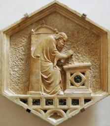 Keywords: Euclid Pisano OPA Florence.jpg Euclid or the Architecture Marble panel from the East side lower basement of the bell tower of Florence Italy Museo dell'Opera del Duomo Euclide ou l'Architecture Panneau en marbre provenant de la façade est registre inférieur du campanile de Florence Euclide o l'Architecttura Marmo proviene dal lato nord del campanile di Firenze basamento inferiore Museo dell'Opera del Duomo Jastrow own picture 1334 “1336 Nino Pisano Italian active ca 1343-1368 Public Domain Nino Pisano Euclid Reliefs of the Giotto's Belltower Compasses in art Personifications of Mathematics Geometry |