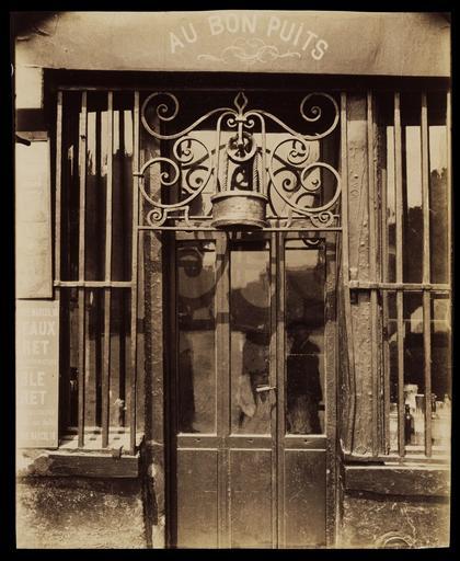 | Keywords: Eugène Atget, Shop Front, rue Michel-Le-Comte - Getty Museum.jpg Artwork en In the 1600s when literacy was rare symbols were used to illustrate the goods and services offered by merchants At this shop front Eugène Atget photographed a sign that featured a wrought iron rope bucket and pulley which allude to a well The refreshment drawn up at Au Bon Puits The Good Well was not water but wine This historic sign is now part of a collection in the Musée Carnavalet that focuses on early pictorial signs 1901 Albumen silver print Image 21 6 x 17 5 cm 8 1/2 x 6 7/8 in Institution Getty Museum object history exhibition history other versions 70006 Inscription Title and negative number inscribed verso print in pencil Secondary Inscription Inscribed verso print in pencil in the hand of André Jammes anc coll x vendu par A Brieux/expo Malerei und Photographie Zurich 1977 no 84 credit line accession number 90 XM 64 46 PD-old-auto 1927 1901 in commerce 1901 in Paris 1901 photographs Photographs of Paris by Eugène Atget Photographs in the Getty Museum Rue Michel-le-Comte Paris Shop signs in Paris Water well pulleys |