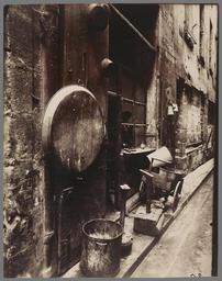 Keywords: Eugène Atget, Tinsmith's Shop, rue de la Reynie - Getty Museum.jpg Artwork en Lying about the sidewalk and on the windowsill are numerous objects and tools from the tinsmith's shop located inside the darkened doorway The teapots pans and basins easily viewed by passersby would have provided an effective advertisement for this tradesman The photograph's unusual point of view indicates that Eugène Atget was working in a very narrow passageway allowing him to record the reflection of sunlight from a variety of timeworn surfaces battered and abraded stone scarred metal and grimy windows 1912 Gelatin silver chloride printing-out paper print Image 22 5 x 17 8 cm 8 7/8 x 7 in Institution Getty Museum object history exhibition history other versions 62229 Markings Atget wet stamp verso print obliterated Inscription Title and negative number inscribed verso print in pencil Negative number is difficult to read credit line accession number 84 XM 1034 5 PD-old-auto 1927 1912 in Paris 1912 photographs Photographs of Paris by Eugène Atget Photographs in the Getty Museum Rue de La Reynie Paris Tinsmiths Historical images of shops in Paris |