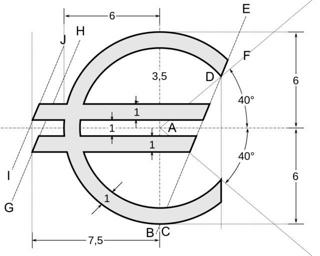 | Keywords: Euro Construction.svg Assessments 5 2007 1 1 1 Euro Das Diagramm zeigt wie das Euro-Symbol gemäß der offiziellen Dokumentation zu zeichnen ist Es wurde explizit für Wikipedia erstellt und ist gemeinfrei ADF und BCDE schneiden sich in D BCDE GH und IJ sind parallel BCDE schneidet die Grundlinie in C Este diagrama ilustra como se diseña el símbolo del euro basado en la documentación oficial y preparado específicamente para la Wikipedia lanzado en el domínio público ADF y BCDE se intersectan en D BCDE GH y IJ son paralelas BCDE intersecta la linea central que pasa por C This diagram illustrates how to draw a euro symbol based on official documentation and has been prepared specifically for Wikipedia and released to the public domain ADF and BCDE intersect at D BCDE GH and IJ are parallel BCDE intersects centerline at C Diagramme illustrant la construction d'un symbole euro et basé sur la documentation officielle Ce diagramme a été préparé spécifiquement pour Wikipédia et appartient au domaine public ADF et BCDE se coupent en D BCDE GH et IJ sont parallèles BCDE coupe en C la verticale passant par A Questo diagramma illustra la costruzione del simbolo dell'euro; è basato sulla documentazione ufficiale ed è stato preparato specificamente per Wikipedia e rilasciato come pubblico dominio ADF e BCDE si intersecano in D BCDE GH e IJ sono parallele BCDE interseca in C la verticale passante per A ユーロのシン ルの書き方図解 公式文書にもとづき ウィキペディアのために 成されPDでリリースされた ADFとBCDEは点Dで交わる BCDE GH IJは平行 BCDEは中心線と点Cで交わる Dit diagram illustreert hoe een euro symbool getekend kan worden gebaseerd op officiële documentatie en is specifiek voor Wikipedia gemaakt en publiekelijk beschikbaar gesteld ADF en BCDE snijden bij D BCDE GH en IJ zijn paralel BCDE snijdt de middelijn bij C Diagram ilustrujące prawidłowy sposób kreślenia znaku euro Diagram został opracowany w celu umieszczenia na Wikipedii i został przekazany przez autora do domeny publicznej Odcinki ADF i BCDE przecinają się w punkcie D Odcinki BCDE GH i IJ są względem siebie równoległe Odcinek BCDE przecina pionową prostą przechodzącą przez środek symbolu w punkcie C Diagrama ilustrando como se desenha o símbolo do euro baseado em documentação oficial e preparado especificamente para a Wikipédia lançado no domínio público ADF e BCDE intersectam-se em D BCDE GH e IJ são paralelas BCDE intersecta a linha central que passa em C Изоб ажение показывает как п авильно согласно официальной спецификации исовать символ Ев о Изоб ажение специально подготовлено для Википедии и п ава на него пе еданы в общественное достояние ADF и BCDE пе есекаются в D BCDE GH и IJ па аллельны BCDE пе есекает линию цент а в C inkscape Own 19 33 30 August 2006 UTC Erina References The official diagrams of the euro symbol are copyrighted and downloadable from the official European Commission site and include http //europa eu int/comm/economy_finance/euro/notes_and_coins/download/constr_en wmf constr_en wmf Windows Metafile WMF with constructions obsolete link http //europa eu int/comm/economy_finance/euro/notes_and_coins/download/euro_en wmf euro_en wmf Windows Metafile WMF without constructions obsolete link http //europa eu int/comm/economy_finance/euro/notes_and_coins/download/constr_en tif constr_en tif TIFF with constructions obsolete link http //europa eu int/comm/economy_finance/euro/notes_and_coins/download/euro_en tif euro_en tif TIFF without constructions obsolete link http //ec europa eu/economy_finance/images/image10483 jpg JPEG with constructions http //ec europa eu/economy_finance/images/image10484 jpg JPEG without constructions The official diagrams are provided in industry standard TIFF and WMF formats and are meant to be imported into a graphics editing program such as Adobe Illustrator or Photoshop The Wikipedia version was created with Adobe Illustrator and rendered in Portable Network Graphics PNG format It bases the guidelines for construction of the symbol on the key data provided for the official symbol but it was prepared from scratch and does not duplicate the official diagram and it is released to the public domain A very similar color version of this diagram is available at en Image EuroConstLargeColor png showing the official euro symbol colors It's prettier to look at but correspondingly more difficult to read Editing Changed the decimal separator to comma International System used in Europe --F l a n k e r 19 13 7 January 2007 UTC Modified the borders of the symbol and trasformed the arrows --F l a n k e r 22 13 10 January 2007 UTC Added the letters --F l a n k e r 22 24 10 January 2007 UTC Construction diagrams of the Euro symbol Featured diagrams Featured pictures on Wikimedia Commons - vector |