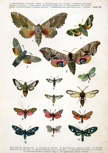 | Keywords: European-butterfly 072-IX.jpg Smerinthus ocellata par Nemos jpg Laothoe populi par Nemos jpg Proserpinus proserpina par Nemos jpg Macroglossum stellatarum par Nemos jpg Hemaris fuciformis par Nemos jpg Sesia apiformis par Nemos jpg Synanthedon culiciformis par Nemos jpg Bembecia hylaeiformis par Nemos jpg Adscita statices par Nemos jpg Zygaena trifolii par Nemos jpg Zygaena purpuralis par Nemos jpg Zygaena carniolica par Nemos jpg Zygaena coronillae par Nemos jpg Amata phegea par Nemos jpg Aglaope infausta par Nemos jpg Plate IX from Europas bekannteste Schmetterlinge Beschreibung der wichtigsten Arten und Anleitung zur Kenntnis und zum Sammeln der Schmetterlinge und Raupen ca 1895 F Nemos Oestergaard Verlag Berlin 18 chromolithographische Tafeln 160 pp http //hdl handle net/10013/epic 28790 d001 2008-01-21 Dr F Nemos Author died more than 70 years ago - public domain PD-old Europas bekannteste Schmetterlinge |