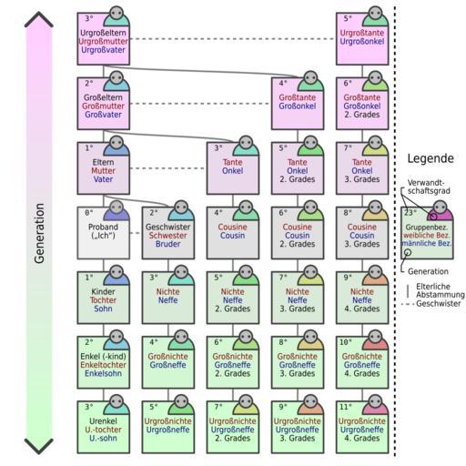 Keywords: European kinship system de.svg The usual European kinship system with German text please translate Das gebräuchliche europäische Verwandschaftssystem mit deutschem Text bitte übersetzen original 2007-04-21 own drawing; eigene zeichnung martis sofias translation possible Kinship Family SVG diagrams in German |