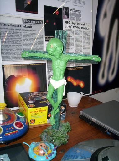 Keywords: Europeen UFO Congress 2005 -01.jpg Europeen UFO Congress 2005 Châlons en Champagne France Les premières rencontres ufologiques Châlons en Champagne France les 14 15 et 16 octobre 2005 Détails d'un stand Taken on october 16 2005 2005-10-16 own assumed Sand~commonswiki UFO Little green men Crucifixion |