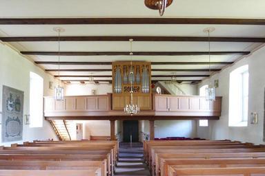Keywords: Evangelisch-lutherische Kirche zu Lauenförde Orgelempore.jpg de Blick zur Empore auf der seit 1977 die Orgel steht die von Carl Giesecke 1864 für die Kirche in Lauenberg Kreis Einbeck erbaut wurde own Bodo Kubrak 2013-08-17 Lauenförde Cc-zero |