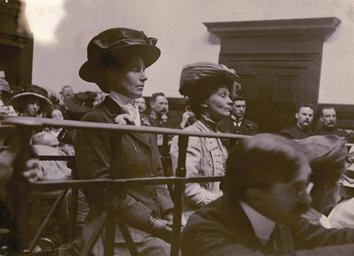 Keywords: the women's library thewomenslibrary women suffrage politics hires 7JCC/O/02/058 Photograph, printed, paper, monochrome, Evelina Haverfield and Emmeline Pankhurst seated in the dock at Bow Street Magistrates' Court; printed inscription on reverse 'Illustrations Bureau, 12 Whitefriars St, EC' 7JCC/O/02/058 Photograph, printed, paper, monochrome, Evelina Haverfield and Emmeline Pankhurst seated in the dock at Bow Street Magistrates' Court; printed inscription on reverse 'Illustrations Bureau, 12 Whitefriars St, EC'