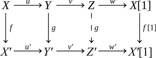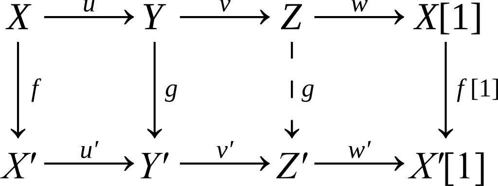 Keywords: Everything commutes.svg For a triangulated category given a map between two morphisms there is a morphism between their mapping cones which exist by axiom TR 1 that makes everything commute This means that in this diagram where f and g form the map of morphisms there exists some map h not necessarily unique making all the squares commute en Image Triangle diagram jpg 2007-03-11 2008-01-23 en User Ryan Reich User Stannered Ryan Reich en Image Triangle diagram jpg en Image Triangle diagram250 jpg Created with Inkscape Mathematical diagrams |
