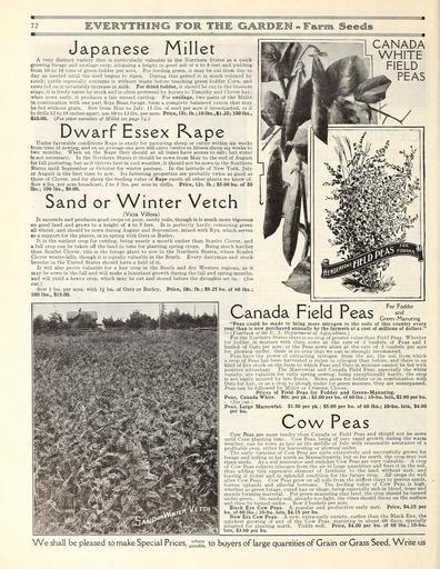 | Keywords: Everything for the garden (16203275688).jpg 72 <br> mi <br> THE GA3RDEM - F m S©©ds <br> Japanese Millet <br> A very distinct variety that is particularly valuable in the Northern States as a quick <br> growing forage and ensilage crop attaining a height in good soil of 6 to 8 feet and yielding <br> from 10 to 18 tons of green fodder per acre For feeding green it may be cut from day to <br> day as needed until the seed begins to ripen During this period it is much relished by <br> scock; cattle especially consume it without waste before touching green fodder Corn and <br> cows fed on it invariably increase in milk For dried fodder it should be cut in the blossom <br> stage; it is freely eaten by stock and is often preferred by horses to Timothy and Clover hay; <br> when sown early it produces a fair second cutting For ensilage two parts of the Millet <br> In combination with one part Soja Bean forage form a complete balanced ration that may <br> be fed without grain Sow from May to July 15 lbs of seed per acre if broadcasted or if <br> in drills 12 to 18 inches apart use 10 to 12 lbs per acre Price 15c lb ; 10 lbs 1 20; 100 lbs <br> S10 00 For other varieties of Millet see page 74 <br> CANADA <br> WHITE <br> FIELD <br> PEAS <br> D <br> war <br> f E <br> ssex <br> Rape <br> Under favorable conditions Rape is ready for pasturing sheep or cattle within six weeks <br> from time of sowing and on an average one acre will carry twelve to fifteen sheep six weeks to <br> two months When on the Rape they should at all times have access to salt; but water <br> Is not necessary In the Northern States it-should be sown from May to the end of August <br> for fall pasturing but as it thrives best in cool weather it should not be sown in the Southern <br> States until September or October for winter pasture In the latitude of New York July <br> or August is the best time to sow Its fattening properties are probably twice as good as <br> those of Clover and for sheep the feeding value of Rape excels all other plants we know of <br> Sow 4 lbs per acre broadcast 2 to 3 lbs per acre in drills Price 12c lb ; 5 00 bu of 50 <br> lbs ; 100 lbs 9 00 <br> Sand or Winter Vetch <br> Vicia Villosa <br> It succeeds and produces good crops on poor sandy soils though it is much more vigorous <br> on good land and grows to a height of 4 to 5 feet It is perfectly hardy remaining green <br> all winter and should be sown during August and September mixed with Rye which serves <br> as a support for the plants or in spring with Oats or Barley <br> It is the earliest crop for cutting being nearly a month earlier than Scarlet Clover and <br> a full crop can be taken off the land in time for planting spring crops Being much hardier <br> than Scarlet Clover this is the forage plant to sow in the Northern States where Scarlet <br> Clover winter-kills though it is equally valuable in the South Every dairyman and stock <br> breeder in the United States should have a field of it <br> It will also prove valuable for a haj' crop in the South and dry Western regions as it <br> may be sown in the fall and will make a luxuriant growth during the fall and spring months <br> and will yield a heavy crop which may be cut and stored before the droughts set in See <br> cut <br> Sow 1 bu per acre with Yz bu of Oats or Barley Price 18c lb ; 9 25 bu of 60 lbs ; <br> 100 lbs 15 00 <br> Canada Field Peas <br> For Fodder <br> and <br> Green-Manuring <br> Peas could be made to bring more nitrogen to the soils of this country every <br> year than is now purchased annually by the farmers at a cost of millions of dollars <br> ” Yearbook of the U S Department of Agriculture <br> For the Northern States there is no crop of greater value than Field Peas Whether <br> for fodder in mixture with Oats sown at the rate of 2 bushels of Peas and 1 <br> bushel of Oats per acre or the Peas sown alone at the rate of 3 bushels per acre <br> for plowing under there is no crop that we can so strongly recommend <br> Peas have the power of extracting nitrogen from the air the soil from which <br> a crop of Peas has been harvested is richer in nitrogen than before and there is no <br> kind of live stock on the farm to which Peas and Oats in mixture cannot be fed with <br> positive advantage The Marrowfat and Canada Field Peas especially the white <br> variety are valuable for early spring sowing; being exceptionally hardy the crop <br> is not easily injured by late frosts Sown alone for fodder or in combination with <br> Oats for hay or as a crop to plough under for green manure they are unsurpassed <br> Peas can be followed by Millet or Crimson Clover <br> Prices of Field Peas for Fodder and Green-Manuring <br> Peas Canada White 80c per pk ; 3 00 per bu of 60 lbs ; 10-bu lots 2 90 per bu <br> - See cut <br> Peas Large Marrowfat 1 50 per pk ; 5 00 per bu of 60 lbs ; 10-bu lots 4 90 <br> per bu <br> Cow Peas <br> Cow Peas are more tender than Canada or Field Peas and should not be sown <br> until Corn planting time Cow Peas being of very rapid growth during the warm <br> weather can be sown as late as the middle of July with reasonable assurance of a <br> profitable crop either for harvesting or plowing under <br> The early varieties of Cow Peas are quite extensively and successfully grown for <br> forage and soiling as far north as Massachusetts but so far north the crop may not <br> ripen seeds As a soil renovator and enricher Cow Peas are very valuable A crop <br> of Cow Peas collects nitrogen from the air in large quantities and fixes it in the soil <br> thus adding this expensive element of fertilizer to the land without cost and <br> leaving it richer and in splendid condition for the future crop All crops do well <br> after Cow Peas Cow Peas grow on all soils from the stiffest clays to porous sands <br> barren uplands and alluvial bottoms The feeding value of Cow Peas is bigh <br> whether as green forage cured hay or silage being especially rich in b