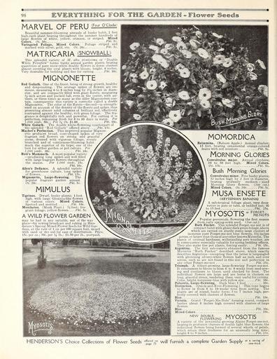 | Keywords: Everything for the garden (16203324348).jpg – iiiiii <br> 98 <br> ;Â¥E1Â¥TH1MG FOM TIE GAR1EM - Flower Seeds <br> MARVEL OF PERU Four ° clocks <br> Beautiful summer-blooming annuals of bushy habit 2 feet <br> high each plant bearing throughout the summer hundreds of <br> large flowers of white yellow crimson or striped Mixed <br> Colors Oz 20c Pkt 5c <br> Variegated Foliage Mixed Colors Foliage striped and <br> marked with silver gold etc Oz 20c Pkt Sc <br> MATRICARIA snowball <br> This splendid variety of M alba plenissima or Double <br> White Feverfew forms bushy annual garden plants bearing <br> quantities of pure snow-white double flowers in dense clusters <br> almost covering the oval plants with bloom; height 8 inches <br> Very desirable for bedding and fine for cutting Pkt 10c <br> MIGNONETTE <br> Red Goliath One of the finest being of strong growth healthy <br> and deep-rooting The average spikes of flowers are im- <br> mense measuring 6 to 8 inches long by 21-2 inches in diam- <br> eter and are compactly filled with giant florets measuring <br> /2 inch across and packed full even in the center with an- <br> thers or three times as many as the older Mignonettes con- <br> tain consequently this variety is correctly called a double <br> Mignonette The color of the florets ” 'fire-red ” is strength- <br> ened on account of the density of the florets and spikes thus <br> presenting almost solid columns of brilliant red effectively <br> contrasted against the healthy rich green foliage The fra- <br> grance is delightfully rich and powerful For cutting it is <br> perfection remaining fresh for 8 to 10 days in water Per <br> 1 000 seeds 50c; Per J4 Oz 1 00 Pkt 10c <br> White Goliath The double white-flowering counterpart of <br> the splendid Red Goliath offered above Pkt 15c <br> Machefs Perfection This improved popular Mignon- <br> ette produces broad cone-shaped spikes of very <br> fragrant red flowers on strong and graceful <br> stems dressed with vigorous foliage evenly <br> branched and of continuous-blooming habit <br> much the superior of its type; one of the <br> best for either garden or pot culture Per <br> 1 000 seeds 30c Pkt 10c <br> Bird's Mammoth A most popular variety <br> – ” 'producing long spikes and well filled <br> with large fragrant flowers throughout <br> the season Per 1 000 seeds 25c <br> Pkt 10c <br> Allen's Defiance A splendid variety <br> for greenhouse culture long spikes <br> of flowers Pkt 15c <br> Mignonette Large-flowering The <br> popular fragrant garden annual <br> Oz 20c Pkt 5c <br> MIMULUS <br> Tigrinus Dwarf bushy plants; 1 foot <br> high with large Gloxinia-like flowers <br> of various colors Mixed Colors <br> Spotted and mottled Pkt 10c <br> Moschatus Musk Plant Hfoot; fra- <br> grant foliage; yellow flowers Pkt 5c <br> A WILD FLOWER GARDEN <br> may be had in any suitable out of the way <br> place ” -by sowing broadcast and raking in Hen- <br> derson's Special Mixed Flower Seeds for Wild Gar- <br> dens at the rate of 1 oz per 100 square feet mixed <br> with sand or dry soil for ease of distribution Price <br> 15c per oz ; 50c per J lb ; SI 50 per lb postpaid <br> MOMORDICA <br> Balsamina Balsam Apple Annual climber; <br> 15 feet bearing ornamental orange-colored <br> fruits with red interiors Pkt 5c <br> Morning Glories <br> Convolvulus major Annual climbers; <br> 30 to 50 feet high Mixed Colors <br> Oz 15c Pkt 5c <br> i Bush Morning Glories <br> i fif - mSRt ' ;S ft \ Convolvulus minor Fine bushy plants; <br> 12 inches high by 2 feet in diameter <br> bearing profusely medium - sized <br> KfcetalBl f Morning Glory flowers See cut <br> Mixed Colors Oz 20c Pkt 5c <br> MUSA ENSETE <br> ABYSSINIAN BANANA <br> A sub-tropical foliage plant very decc <br> rative in pots or tubs or bedded out; 10 <br> to 15 feet Pkt 25c <br> MYOSOTIS or oYs <br> Popular perennials flowering the first season <br> from early spring-sown seed See cut <br> Ruth Fischer This splendid Forget-me-not is of <br> compact habit with glossy dark green foliage above <br> which are carried on sturdy stems large clusters of <br> immense pure Forget-me-not blue flowers \Yi inches <br> across or larger than those of any other known Myosotis The <br> plants of unusual hardiness withstanding zero weather are <br> in consequence especially valuable for spring bedding effects <br> They also make fine pot plants forcing easily Pkt 15c <br> Argentina The first sub-variety obtained from the famous <br> Myosotis Ruth Fischer described above which exactly <br> describes Argentina ” excepting that the latter is bespangled <br> with glistening silvery-white flowers half an inch and over <br> across such as are not found in this size and perfection in <br> any other Forget-me-not Pkt 25c <br> Triumph A robust-growing large-flowering Forget-me-not <br> It commences to bloom in from 6 to 8 weeks from seed-sow- <br> ing and continues to bloom until checked by frost The <br> individual flowers are large and are borne in clusters on <br> long graceful stems rendering them very useful for cutting <br> Color bright turquoise-blue with yellow eye Pkt 10c <br> Palustris Large-flowering Dark blue; 1 foot 10c <br> Distinction Quick-and-Ever-Flowering This type begins <br> to flower in from 8 to 10 weeks' time from sowing The <br> plants are of round bushy form; 5 to 7 inches high per- <br> fectly covered with clusters of flowers <br> Blue Pkt 10c <br> Victoria Grand Forget-Me-Nots forming round compact <br> bushes about 8 inches high covered with clusters of large <br> flowers <br> Blue Pkt 10c <br> Mixed Colors 10c <br> NEW DOUBLE- MYO'sPlTK <br> FLOWERING ' 1 » \J3\J 1 1J <br> A variety of the pyramidal growing Alpine Forget-me-not <br> bearing in profusion clusters of double light blue flowers the <br> individual flowers being formed of several whorls of petals <br> which retain their freshness for an unusually long time; <br> height 8 to 9 inches Pkt 25c <br> HENDERSON'S Choi