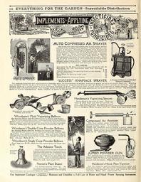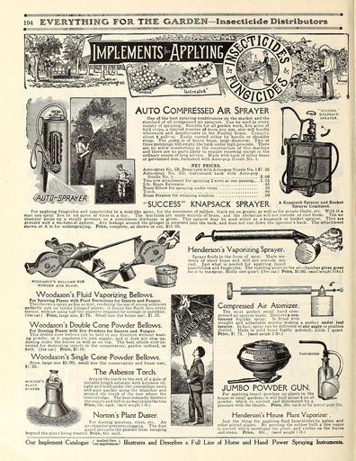 | Keywords: Everything for the garden (16203533078).jpg Auto Compressed Air Sprayer <br> One of the best spraying contrivances on the market and the <br> standard of all compressed air sprayers Can be used in every <br> variety of spraying Suitable for all garden work five acres of <br> field crops a limited number of trees any size also will handle <br> whitewash and disinfectants in the Poultry house Capacity <br> about 4 gallons Easily carried either by handle or shoulder <br> strap The pump is of heavy brass large diameter Two or <br> three pumpings will empty the tank under high pressure There <br> are no screw connections in the construction of this machine <br> and there are no parts likely to require renewing except in the <br> ordinary course of long service Made with tank of either brass <br> or galvanized iron furnished with Auto-pop Nozzle No 1 <br> NET PRICES <br> Auto-spray No IB Brass tank with Auto-pop Nozzle No 1 7 25 <br> Auto-spray No ID Galvanized tank with Auto-pop <br> Nozzle No 1 5 00 <br> Two row attachment for spraying 2 rows at one passing 1 35 <br> 2 ft Brass Extension 45 <br> Brass Elbow for spraying under vines 30 <br> Torch 90 <br> Brass Strainer for straining solution 90 <br> SUCCESS KNAPSACK SPRAYER <br> - „¢ ' ' SUCCESS <br> T«» KNAPSACK <br> A Knapsack Sprayer and Bucket <br> Sprayer Combined <br> For applying fungicides and insecticides in a mist-like spray for the treatment of mildew black rot on grapes as well as for potato blight etc With it a <br> man can spray five to six acres of vines in a day The machines are made entirely of brass and the chemicals will not corrode or rust them The air <br> chamber keeps up a steady pressure so a continuous discharge is given This sprayer may be used either as a knapsack or bucket sprayer They are <br> provided with a mechanical agitator Any leakage around the plunger is returned into the tank and does not run down the operator's back The attachment <br> shown at A is for underspraying Price complete as shown in cut 13 00 <br> JM T W I ll' HJ il i n J i' in in n i n ' j <br> Henderson's Vaporizing Sprayer <br> Sprays fluids in the form of mist Made en- <br> tirely of sheet brass and will not corrode nor <br> rust Just what is needed for applying liquid <br> insecticides and fungicides The tapering point to the air-chamber gives great <br> force to tne spray Holds one quart See cut Price 1 00 mail weight 3lbs <br> WOODASON'S BELLOWS FOR <br> POWDER AND FLUID <br> Woodason's Fluid Vaporizing Bellows <br> For Spraying Plants with Fluid Decoctions for Insects and Fungus <br> This throws a spray as fine as mist rendering the use of strong solutions <br> perfectly safe on tender foliaged plants; it forces the fluids into every <br> crevice without using half the quantity required by syringe or sprinkler <br> See cut Price large size 1 75 Small size for house use SI 25 <br> Woodason's Double Cone Powder Bellows <br> For Dusting Plants with Dry Powders for Insects and Fungus <br> This double cone bellows can be held in any direction without wast- <br> ing powder as it regulates its own supply and it does not clog up <br> dusting under the leaves as well as on top The best article ever in- <br> vented for destroying insects in the conservatory garden orchard or <br> field See cut Price 3 00 <br> Woodason's Single Cone Powder Bellows <br> Price large size 2 00; small size for conservatory and house use <br> 1 25 <br> The Asbestos Torch <br> Attach the torch to the end of a pole of <br> suitable length saturate with kerosene oil <br> light and hold under the caterpillars nests <br> and pass quickly along the branches and <br> around the trunk of the tree where the <br> insects lodge The heat instantly destroys <br> the insects and will in no way in jure the tree <br> Price 35c each mail weight 1 lb <br> Norton's Plant Duster <br> For dusting potatoes vines etc An <br> air-chamber prevents clogging The dust <br> guard prevents the powder from escaping <br> beyond the plant being treated Price 85c each <br> NORTON s <br> PLANT <br> DUSTER <br> Compressed Air Atomizer <br> The most perfect small hand com- <br> pressed air sprayer made Delivers a con- <br> tinuous fog-like spray Is fitted with <br> straight and adjustable nozzles making a perfect under leaf <br> sprayer In fact spray can be delivered at any angle or position <br> desired Made in solid brass highly polished; holds 1 quart <br> Price 1 75 mail weight 2 lbs <br> JUMBO POWDER GUN <br> For applying insect powders on plants in the <br> house or small gardens; it will hold about 4 oz of <br> powder which is ejected and distributed by a <br> pressure with the thumb Price 20c each or by parcel post 25c- <br> Henderson's House Plant Vaporizer <br> Just the thing for applying fluid Insecticides to palms and <br> other potted plants By pressing the rubber bulb a fine vapor <br> is ejected which envelopes the plant and settles on the leaves <br> and stems Price 60c mail weight 1 lb <br> Our Implement Catalogue on pudton Illustrates and Describes a Full Line of Horse and Hand Power Spraying Instruments 43874986 149634 78295 Page 194 Text http //www biodiversitylibrary org/page/43874986 c1915 10 5962/bhl title 78295 Henry G Gilbert Nursery and Seed Trade Catalog Collection ; Peter Henderson Co Biodiversity Heritage Library Everything for the garden 1915 Garden Stories Books Bulbs Plants Catalogs Equipment and supplies Flowers Gardening Lawn mowers Seeds U S Department of Agriculture National Agricultural Library bhl page 43874986 dc identifier http //biodiversitylibrary org/page/43874986 bhlGardenStories BHLinbloom bulbs plants u s department of agriculture national agricultural library bhlgardenstories bhlinbloom Information field Flickr posted date ISOdate 2015-01-28 Check categories 2015 August 25 CC-BY-2 0 BioDivLibrary https //flickr com/photos/61021753 N02/16203533078 2015-08-25 01 50 21 cc-by-2 0 PD-old-70-1923 Everything for the garden 1915 Photos uploaded from