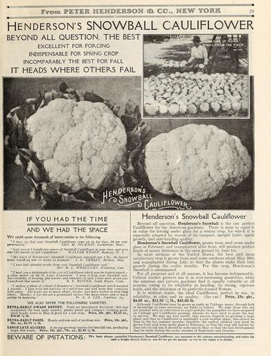 Keywords: Everything for the garden (16204921607).jpg Frosmi FETEM MEHPEIRSOM ® C© ž HEW YOM <br> 25 <br> Hendersons SNOWBALL CAULIFLOWER <br> BEYOND ALL QUESTION THE BEST <br> EXCELLENT FOR FOKCING <br> INDISPENSABLE FOR SPRING CROP <br> INCOMPARABLY THE BEST FOR FALL <br> IT HEADS WHERE OTHEKS FAIL <br> IF YOU HAD THE TIME <br> AND WE HAD THE SPACE <br> We could quote thousands of letters similar to the following <br> I may say that your Snowball Cauliflower came up in five days 98 per cent <br> germinating GEO M DICKSON Leominster Mass <br> Last season I bought two ounces of Snowball Cauliflower at your store and grew <br> over ISO barrels of fine Cauliflower WALTER KNOPP Ramsay N J <br> My patch of Henderson's Snowball Cauliflower averaged over 5 lbs the largest <br> beine something over 13 inches in diameter J E THREFT Bristow Okla <br> I have had splendid results from your Snowball Cauliflower seed <br> Mrs H C WHELLAMS Winnipeg Can <br> I mail you a photograph of the case of Cauliflower which won the highest award ” – <br> a silver medal ” at the St Louis Exposition 1 grew it from your Snowball seed <br> For reliability of heading fine texture and whiteness of curd I have never grown any <br> Cauliflower that equals it R E HISTED South Haven Conn <br> I enclose a photo of a head of Henderson's Snowball Cauliflower which weighed <br> 4 pounds I have tried five varieties of Cauliflower and find none that compares <br> with yours The heads are so much whiter harder and more perfect inform than <br> others Besides it has not got a granulated surface like many others and is much <br> earlier in maturing Dr E A LEE Jennings La <br> WE ALSO OFFER THE FOLLOWING VARIETIES <br> EXTRA-EARLY DWARF ERFURT Until we introduced Snowball this - was <br> considered the best early variety; plaats dwarf and compact forming good- <br> sized heads; sown in May is good for a fall crop Price 20c pkt 3 25 oz <br> 10 00 M lb- <br> EXTRA-EARLY PARIS Heads uniform and of medium size Price 10c pkt <br> 80c oz 2 75 4 lb <br> LARGE LATE ALGIERS A strong-growing variety for late fall use producing <br> large fine heads Price 10c pkt 75c oz 2 50 M lb <br> Henderson's Snowball Cauliflower <br> Beyond all question Henderson's Snowball is the one perfect <br> Cauliflower for the American gardener There is none to equal it <br> in value for forcing under glass for a winter crop for which it is <br> especially adapted by reason of its compact upright habit quick <br> growth and sure-heading quality <br> Henderson's Snowball Cauliflower grown from seed sown under <br> glass in February and transplanted after frost will produce perfect <br> heads of snowy whiteness in the open ground by June 1st <br> In most sections of the United States the best and most <br> satisfactory crop is grown from seed sown outdoors about May 20th <br> and transplanted during July so that the plants make their best <br> growth during the cooler months For this crop Henderson's <br> Snowball is unsurpassed <br> For all purposes and at all seasons it has become indispensable <br> Critical market growers use it in ever-increasing quantities while <br> the amateur and private gardener find it equally valuable at all <br> seasons owing to its reliability in heading its strong vigorous <br> habit and the whiteness of its perfectly-formed flowers <br> It is without doubt the ideal Cauliflower perfect in size in <br> reliability in color and in quality See cut Price 25c pkt <br> 4 00 oz 12 50 H lb 45 00 lb <br> Although Cauliflower may be grown as easily as Cabbage many through lack <br> of knowledge of some essentials are liable to failure We urge those who are <br> not familiar with its cultivation to read carefully the pamphlet we have prepared <br> on Cabbage and Cauliflower growing wherein we have tried to point the way <br> to success We may say here briefly that success depends on growing a large <br> plant and that as Cauliflower is essentially a cool weather plant this cannot be <br> done in the hot summer months; therefore the earliest outdoor crop must be <br> grown from seed sown under glass in February so that the crop will mature by <br> June 1st; for fall use it should be sown late in May so that the best development <br> may be made during the cooler weather of September and October <br> BEWARF OF I II I A I lOI JS e bave always controlled Henderson's Snowball Cauliflower any statement to the contrary notwithstanding and unless the <br> /\I\L_ \ /l 11 11 1 r i 1 l yi U seec j j s b OU g nt directly from us you do not get the genuine as we do not supply it to dealers 43874817 149634 78295 Page 25 Text http //www biodiversitylibrary org/page/43874817 c1915 10 5962/bhl title 78295 Henry G Gilbert Nursery and Seed Trade Catalog Collection ; Peter Henderson Co Biodiversity Heritage Library Everything for the garden 1915 Garden Stories Books Bulbs Plants Catalogs Equipment and supplies Flowers Gardening Lawn mowers Seeds U S Department of Agriculture National Agricultural Library bhl page 43874817 dc identifier http //biodiversitylibrary org/page/43874817 bhlGardenStories BHLinbloom bulbs plants u s department of agriculture national agricultural library bhlgardenstories bhlinbloom Information field Flickr posted date ISOdate 2015-01-28 Check categories 2015 August 25 CC-BY-2 0 BioDivLibrary https //flickr com/photos/61021753 N02/16204921607 2015-08-25 03 00 43 cc-by-2 0 PD-old-70-1923 Everything for the garden 1915 Photos uploaded from Flickr by Fæ using a script |