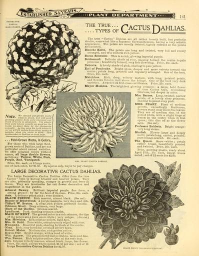 Keywords: Everything for the garden (16234318343).jpg PLAIMT DEPARXIVIEIMT <br> 161 <br> DECORATIVE <br> DAHLIA <br> MAID OF E£K <br> r\ffi famish poU own roots <br> 1 yum yrbile in stock but will send <br> growing plants from pots wlienever our <br> stock of roots is exhausted Ttie plants <br> from pots bloom equally as good as the <br> roots; we plant tbem by the thousands <br> annually As the price for both is identi- <br> cal we will OH orders 6-om either as stock <br> permits when the order is tilled This <br> applies also to Dahlias on next page <br> Field-Grown Roots in Colors <br> For those – who -wish large field- <br> grown roots of Dahlias and are not <br> particular about named varieties <br> we offer separate colors without <br> names all large double flowers <br> as follows Yellovr White Pink <br> Purple Red Variegated <br> Price 30c each or 6 large roots <br> one of each color for 1 50 By express only <br> ' 'typS of rACTUS pAHLIAS <br> The true Cactus Dahlias are all rather loosely built but perfectly <br> double somewhat lilfe a Japanese Chrysanthemum having a very artistic <br> appearance The petals are mostly twisted tightly reflexed at the points <br> and pointed <br> Blanche Keith The petals are long and twisted very full and evenly <br> arranged and of a uniform rich yellow <br> Baron Schroder This is a rich glowing imperial purple <br> Bridesmaid Delicate shade of rose passing toward the centre to pale <br> primrose ; beautifully formed very free flowering Price 40c each <br> Delicata A lovely shade of pink shading to pale yellow <br> Earl of Pembroke Bright plum deeper and more velvety toward the <br> centre ; petals long pointed and regularly arranged One of the best <br> Price 2oc each <br> Matchless Rich deep velvety maroon with long pointed petals <br> and flowers thrown well above the foliage One of the best very dark <br> varieties Awarded 22 flrst-class certificates Price 25c each <br> Mayor Haskins The brightest glowing crimson ; a large bold flower <br> oi true Cactus type resembling <br> Gloriosa but deeper in color <br> Mrs Barnes Long twisted narrow <br> petals of a lovely clear primrose <br> shading to palest rosy pink <br> MRS PEART Plant of medium <br> growth exceedingly floriferous <br> flowers stand clear above the leaves <br> They are of medium size of the <br> purest white with a slight tinge of <br> lemon in the centre when it first <br> opens ; this dies off as the flower <br> ages See cut <br> Professor Bald-win Bright orange; <br> very long stems <br> Starfish Flower large and deeply <br> built; petals long curled pointed; <br> pure orange-scarlet 40c each <br> The Queen Snow-white ; petals <br> rather broad beautifully pointed <br> and twisted Price 25c each <br> Price growing plants ready about <br> April 15th 15c each except where <br> noted ; set of 12 sorts for 2 00 <br> MRS PEABT CACTUS DAHLIA <br> buyer to pay charges <br> LARGE DECORATIVE CACTUS DAHLIAS <br> The Large Decorative Cactus Dahlias differ from the true <br> ' Cactus type in having broader and heavier petals They <br> are also generally speaking stonger in growth and freer in <br> bloom They are invaluable for cut flower decoration and <br> magnificent in the garden <br> Admiral Dewey Brilliant imperial purple fine form a <br> strong grower ; by far the best of its class Price 25c each <br> Asia A delicate peach pink ; very distinct <br> BLACK PRINCE Rich maroon almost black See cut <br> Beauty of Brentwood A purple magenta verj- deep and I'ich <br> Clifford W Bruton A clear rich yellow perfectly double <br> Crimson Giant Deep crimson very large <br> Glare of the Garden Intense scarlet <br> Lyndhurst Dark dazzling crimson-scarlet <br> MAID OP KENT The ground color is a rich crimson the tips <br> of the petals are a pure snow-white ; very unique iS'ee cut <br> Mrs Hawkins Eich sulphur-yellow light tips <br> Mrs G Reid Pure white conspicuously edged with rose <br> Nymphaga Beautiful pink shading to blush at the centre <br> Oban Eieh rosy lavender overlaid silvery fawn <br> Robert Maher Medium size rich golden-yellow <br> Rayon d'Or Bright orange with a band of white <br> Wm Aguew The grandest red Cactus Dahlia large and fine <br> Wm Pearce Rich sulphur-yellow One of the very best <br> Zulu Intense velvety maroon almost black; large fine flower <br> Price 15c each except where noted 1 50 per doz ; set of 18 <br> Large Decorative Cactus Dahlias for S2 50 <br> BLACK PRIXCE nECOnATIVE DAHLIA 42383250 133997 66553 Page 161 Text http //www biodiversitylibrary org/page/42383250 1902 10 5962/bhl title 66553 Henry G Gilbert Nursery and Seed Trade Catalog Collection ; Peter Henderson Co NameFound Chrysanthemum NameConfirmed Chrysanthemum EOLID 38388 NameBankID 2657422 NameFound Delicata NameConfirmed Delicata Krammer 2003 EOLID 9080777 NameFound Gloriosa NameConfirmed Gloriosa EOLID 33237 NameBankID 2665167 NameFound Medium NameConfirmed Medium NameBankID 4904049 Biodiversity Heritage Library Everything for the garden 1901 Garden Stories Catalogs Flowers Peter Henderson Co Plants Ornamental Seed industry and trade Seeds Trade catalogs U S Department of Agriculture National Agricultural Library bhl page 42383250 dc identifier http //biodiversitylibrary org/page/42383250 bhlGardenStories Cactus Dahlias BHLinbloom peter henderson co plants ornamental u s department of agriculture national agricultural library bhlgardenstories cactus dahlias bhlinbloom Information field Flickr posted date ISOdate 2015-03-18 Check categories 2015 August 24 CC-BY-2 0 BioDivLibrary https //flickr com/photos/61021753 N02/16234318343 2015-08-24 20 51 50 cc-by-2 0 PD-old-70-1923 Everything for the garden 1902 Photos uploaded from Flickr by Fæ using a script |