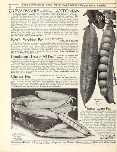 Keywords: Everything for the garden (16390865595).jpg <br> above <br> Thomas Laxton Pea <br> An extra early wrinkled marrow of excellent <br> quality and a valuable addition to the very early <br> varieties It is three feet high and somewhat <br> more vigorous in habit than Prosperity The <br> pods are medium to large blunt ended and filled <br> to the tip with large Peas of true rich mar- <br> -~3 row flavor Its strong vine and heavy crop- <br> g character make it very suitable for an <br> arly crop in the private garden It may <br> be used to great advantage as an im- <br> mediate successor to Prosperity If <br> sown together Thomas Laxton <br> will be in full production <br> just as the crop of Pros- <br> perity is diminishing <br> Price 15c pkt 30c <br> s pt 55c qt 2 00 for <br> 4 qts 3 50 peck <br> We deliver Free in U S j by P Par ' Post - Express J Vegetable and Flower Seeds j by he pkt ~ ~ Also Lawn Grass Seeds <br> __ ___-_-___ __ _ or Freight at our option and quarter lb I 43874842 149634 78295 Page 50 Text http //www biodiversitylibrary org/page/43874842 c1915 10 5962/bhl title 78295 Henry G Gilbert Nursery and Seed Trade Catalog Collection ; Peter Henderson Co Biodiversity Heritage Library Everything for the garden 1915 Garden Stories Books Bulbs Plants Catalogs Equipment and supplies Flowers Gardening Lawn mowers Seeds U S Department of Agriculture National Agricultural Library bhl page 43874842 dc identifier http //biodiversitylibrary org/page/43874842 bhlGardenStories BHLinbloom bulbs plants u s department of agriculture national agricultural library bhlgardenstories bhlinbloom Information field Flickr posted date ISOdate 2015-01-28 Check categories 2015 August 25 CC-BY-2 0 BioDivLibrary https //flickr com/photos/61021753 N02/16390865595 2015-08-25 03 02 48 cc-by-2 0 PD-old-70-1923 Everything for the garden 1915 Photos uploaded from Flickr by Fæ using a script |