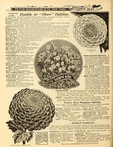| Keywords: Everything for the garden (16666693598).jpg <br> Souv de Mme Moreau Immense <br> size deep pink perfect form <br> Storm King See cut <br> Uncertainty Deep crimson varie- <br> gated with pure white <br> Village Maid Primrose-yellow suf- <br> fused rosy carmine <br> Price 15c each except where spe- <br> cially priced ; set of 30 sorts for S-t OO <br> any 6 for 75c any 12 for SI 50 <br> DOUBLE DAHLIA <br> SNOW <br> FERN-LEAVED BEAUTY A <br> new and distinct type with fern- <br> like foliage and a dwarf branch- <br> ing habit; color creamy white <br> with a distinct margin of crim- <br> son around each petal Price <br> 20c each 2 00 per doz <br> GILT EDGE A variety some- <br> what similar in character to the <br> above The markings are white <br> and gold the latter shade being <br> on the outer edge of each petal <br> Price 20c each 2 00 per doz <br> MRS LANGTRY A very hand- <br> some variety containing a strik- <br> ing combination of shades The <br> main color is rich creamy white <br> tipped reddish pink and marked <br> on the edge with distlnctpurplish <br> crimson A strong grower and <br> very profuse bloomer See cui <br> Price 20c each 2 00 per doz <br> STORM KING An early profuse and constant bloomer ; a strong <br> grower of dwarf habit Snow-white of perfect form and full to <br> the centre It is far ahead of any other See cut Strong plants <br> ready April 15th Price 25c each 2 25 per doz <br> SNOTW A magnificent snow-white large-flowering Dahlia; fine sub- <br> stance perfect form long stems and a healthy grower A very <br> ornamental variety See cut Price 20c each 2 00 per doz <br> Twelve Best Pompone Dahlias <br> These differ from the Large varieties in being more dwarf in growth <br> with smaller fiowers and added profusion of bloom <br> AchiUes Beautiful pure pink <br> Beauty Inconstant Eich yellow <br> striped vermilion <br> Ben Butler Crimson-maroon <br> Black Dwarf Maroon <br> Fanny Weiner Wliite tipped <br> crimson A vei7 fine variety <br> Juliet Orange and yellow <br> Leila Flesh mottled crimson <br> Little Prince Eed mottled crim- <br> son sometimes tipped white <br> Little Valentine Eich scarlet <br> Miss L Kramer Carmine-red <br> Snowclad Pure white <br> Sunshine A grand scarlet Perfect <br> form grand habit free bloomer <br> Price 15c each set of 12 for 1 50 <br> SINGLE DAHLIAS <br> Many people prefer these to the double varieties because of their grace free- <br> dom of bloom adaptability for bouquets decorations and wherever cut flowers <br> used They are certainly extremely useful for all the foregoing purposes <br> US' See note on <br> pate 161 about Roots <br> and Plants A BOOK <br> ON DAHLIAS giving <br> complete cultural in- <br> structions may be <br> had as a premium <br> on orders See <br> page S <br> DOVBLE DAHLIA MBS LANOTBY <br> Ami Barillet Scarlet-crimson <br> flowers purple foliage <br> Brilliant Verv brilliant scarlet <br> Cloth of Gold Eich yellow <br> Fashion Crimson-maroon <br> flamed purple light disc <br> Juno White tipped lavender <br> yellow disc <br> Price 15c each <br> Polly Eccles Satin fawn with red disc A <br> charming contrast <br> Sandusky Deep magenta-red <br> SnoviT- Queen Pure white Largo handsome <br> flowers a grand variety for every purpose <br> Yellow Gem Golden yellow A fitting <br> companion to the above and where one is <br> planted the other should be <br> 1 50 per doz set of 9 for 1 00 42383251 133997 66553 Page 162 Text http //www biodiversitylibrary org/page/42383251 1902 10 5962/bhl title 66553 Henry G Gilbert Nursery and Seed Trade Catalog Collection ; Peter Henderson Co NameFound Arabella NameConfirmed Arabella EOLID 52830 NameBankID 2551431 Biodiversity Heritage Library Everything for the garden 1901 Garden Stories Catalogs Flowers Peter Henderson Co Plants Ornamental Seed industry and trade Seeds Trade catalogs Vegetables U S Department of Agriculture National Agricultural Library bhl page 42383251 dc identifier http //biodiversitylibrary org/page/42383251 bhlGardenStories Dahlias BHLinbloom peter henderson co plants ornamental u s department of agriculture national agricultural library bhlgardenstories bhlinbloom Information field Flickr posted date ISOdate 2015-03-18 Check categories 2015 August 24 CC-BY-2 0 BioDivLibrary https //flickr com/photos/61021753 N02/16666693598 2015-08-24 20 54 09 cc-by-2 0 PD-old-70-1923 Everything for the garden 1902 Photos uploaded from Flickr by Fæ using a script |
