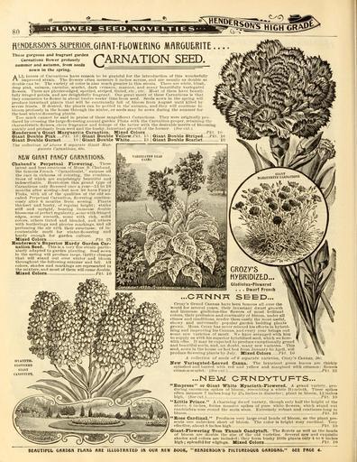 Keywords: Everything for the garden (16828274336).jpg 80 <br> I <br> FLOWER SEED <br> f FNDERSON-S SUPERIOR niflNT-FUnWFRINri MflRGUERITE <br> f ARNATION SEED <br> These gorgeous and fragrant garden <br> Carnations flower profusely <br> summer and autumn from seeds <br> sown in the spring <br> ALL lovers ot Cai-nations have reason to be grateful for the introduction of this wonderfully <br> improved strain The flowers often measure 3 inches across and are usually as double as <br> double can be The variety of color Is also much greater in this strain There are wliite blush <br> deep pink salmon carmiiie scarlet dark crimson maroon and nian v beautltuil v variegated <br> flowers There are picotee-edged spotted striped tinted etc etc Most of them have beauti- <br> fully fringed petals and are delightfull v fragrant One great merit of these Carnations is that <br> they commence to flower in about twelve weeks' time from seed Seeds sown in the spring will <br> produce luxuriant plants that will be continually full of bloom from August until killed by <br> severe frosts If desired the plants can be potted in the'autumn and they will continue to <br> bloom profusely in the house through the winter or seeds may be sown during the summer for <br> the best winter-flowering plants <br> Too much cannot be said in praise of tliese magnificent Carnations They were originally pro- <br> duced by crossing the large-flowering annual garden Pinks with the Carnation proper retaining the <br> characteristic flowers ilove fragrance and foliage of the latter with the desirable merits of blooming <br> quickly and ijrofusely from seed and the bushy luxuriant growth of the former See cut <br> Henderson's Giant Margoierite Carnation Mixed Colors Pkt lo <br> Giant Doitble Pink Pkt 10 I Giant Double Yellow / A- f ir Giant Double Striped Pkt 10 <br> Giant Double Garnet 10 Giant Double White 1 Giant Double Scarlet 10 <br> The collection of nhore 6 separate Giant Mar- <br> sxucnte Carnations 00c <br> NEW GlftNT FflNGY GftRNftTiONS <br> Chaband's Perpetual Plowerinff These <br> latest and best creations of Jlons B Chabaud <br> the famous French Caruationist surpass all <br> the race in richness of coloring the c' mbin;i- <br> tions of which are surprisingly beautiful and <br> indescribable Heretofore this grand type of <br> Carnations only flowered once a year ” 15 to 18 <br> months after sowing ” but now we have Fancy <br> Pinks wntli all of the qualities of tlie old so- <br> called Perpetual Carnation flowering continu- <br> ously after J months from sowing Plants <br> thickset and bushy of regulai; height; stalks <br> stiff and upright bearing immense double <br> blossoms of perfect regularity somewith triugi'd <br> edges some smooth some with rich sulid <br> colors others tinted and blended and others <br> with featherings and picotee markings and all <br> perfuming the air with their sweetness; of in- <br> contestable merit for winter-flowering and <br> hardy enough for garden culture <br> Dlized Colors Pkt 2 5 <br> Henderson's Superior Hardy Garden Car- <br> nation Seed This is a very fine strain partic- <br> ularly adapted to garden planting Seed sown <br> In the spring will produce large thrifty clumps <br> that will stand out over winter and idoom <br> throughout the following summer and fall All <br> colors shades and markings are represented in <br> the mixture and most of them will come double <br> Mixed Colors Pkt lo <br> GROZY'S <br> HYBRIDIZED <br> Gladiolus-Flowered <br> Dwarf Prench <br> CHNNH <br> Crozy's Grand C'annas have been famous all over the <br> world for several years their luxuriant dwari growth <br> and immense gladiolus-like flowers of most brilliant <br> colors their profusion and continuity of bloom under all <br> climes and conditions render them easily the most useful <br> slidwy and universally popular garden bedding plants <br> gniwn Mons Crozy has never relaxed his efforts in hytirld- <br> iziiigand improving his Cannas and every year brings out <br> siiiiie new varieties of merit We have arranged with him <br> to siipiily us with his superior hybridized seed which we here- <br> with offer It may be expected to roduce exceptionally grand <br> and beautiful sorts and no doubt many new varieties This <br> seed sown in the house or hot bed from Tanuar v to April will <br> produce flowering plants by July Mixed Colors Pkt 10 <br> A collection of seeds of G sejiarate varieties Crozj'fi Cannas SOc <br> New Varie ated-Iieaved Canna The luxuriant green leaves are thickly <br> splashed and barred with red and yellow and margined with crimson flowers <br> crimson-scarlet See cut Pkt 25 <br> NE1a£ C7 NDVTUI TS <br> Empress or Giant White Hyacinth-Plowered A grand variety pro- <br> ducing enormous spikes of bloom resembling a white H vacinth Tlie se spikes <br> often measure 7 inches loug bv tiVi inches in diameter; plant in bloom 12 inches <br> high See cut ' Pkt 10 <br> Iiittle Prince A charming dwni-f variety though only half the height of the <br> aliove j Indies forms massive sjjikes of pure white flowers which stand out <br> candelabra-wise round the main stem E xtremely robust and continues long in <br> blc <br> If 10 <br> Rose Cardinal Produces very large oval heads of bloom so the plant pre- <br> sents one unbroken sheet of bloom The color is bright rosy cardinal Very <br> effective about S Inches liigli Pkt lb <br> Giant-Flowering' Tom Thumb Candytuft The florets as well as the heads <br> of bloom are double the size of the old varieties Several new and exquisite <br> shades and colors are included ; they form bushy little plants only 4 to 6 inches <br> high ; splendid for edgings Mixed Colors Pkt 10 <br> BEflUTlfUL GflRDEK FLANS ARE ILLUSTRATED IK OUR hEW SOOK HENDERSON'S FICTURESQUE GARDENS SEE PAGE 4 42383169 133997 66553 Page 80 Text http //www biodiversitylibrary org/page/42383169 1902 10 5962/bhl title 66553 Henry G Gilbert Nursery and Seed Trade Catalog Collection ; Peter 