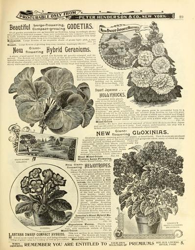 Keywords: Everything for the garden (16828292486).jpg ˘PETER HENDERSO N fl; CO IMEW YORK <br> 89 <br> Beaatifal crirctTo' Tn g GODETIAS <br> Of all earden annuals few are as beautiful as Godetias being exceedingly showy <br> when grown in beds and masses; these new varieties are very compact and bushy <br> In habit forming oval plants about 1 foot high completely enveloped with large <br> Eorsreouslv colored flowers from 2 to 3 inches across <br> Rosamond Large flowers of an exquisite shade of glossy light plnk a mre <br> Sunset Large iaowers of glowing deep rosy carmine dazzlingly effective 20 <br> Ilem <br> Giant- <br> flotuering <br> Hybrid GeFaniams <br> A strain of seed saved from grand new Hybrids all greatly enlarged and im- <br> DFOved The flowers are extra large round of the most perie t forms borne on <br> splendid trusses some of them forming balls 16 inches in circumference The i rs <br> are all shades of scarlet and crimson rose pink salmon cream veined pink blush <br> snowv white and all of the new auricle types with lovely rings and large white eyes <br> these all stand the M <br> sun Although perm <br> nials they will produce i <br> bushy plants and flower <br> seeds sown the same si i <br> gorgeous flowers of mo <br> borne continuousU ren <br> ular plants for pot cultuic in wintei or toi <br> bidding out in summer <br> 1 J to 18 ini lies hi ;h s <br> cnt /'A' 1 <br> Doiarf Japanese <br> HOIiliYHOCKS <br> Pyramidal little plants <br> only 15 to 18 inches high <br> jiroducing large semidouble <br> llowers frombaseto summit <br> These very unique and beautiful <br> Hollyhocks from the Flowery <br> kini vdom are great acquisitions The plants grf <br> Kingdom are fercrt ' covered from bottom to top with semi <br> row in pyramidal form to a <br> i'oTI -We h ve'jusrrec of these mtle Hollyhocks from Japan <br> NEW «°iT rn3 Giioxmifls <br> ost charming greenhouse plants of dwarf habit Their flowers are produced <br> ton and of thi most exquisite and gorgeous colors many of which are mag- <br> ' e <br> GIANT B\BRID <br> GERANIUM <br> Gloxinias are m <br> i fi nHrspStted mottl 5 and'blended Un ier the <br> commonest culture they bloom continuously for <br> months This new giant strain produces <br> flowers of extraordinarily large_ dimen- <br> sions measuring from 4V2 to o inches <br> across The colors are rich varied and <br> strikingly beautiful 1 foot See cut <br> Giant lAixed Colors P - <br> Gloxinia Largre Flowering <br> Choice Mixed Colors /'At 2 <br> oiant- jiEiiioTt OPES <br> flotueping <br> Those who have not seen these mag- <br> Diflcent Heliotropes can have no con- <br> ception of the great advance made <br> in improving this old favorite <br> The heads of blossoms of this <br> new sort often measure a foot <br> across the individual ilorets <br> are also very large and their <br> delicious perfume is just as <br> enchanting as in the old small- <br> flowering types The plants <br> of the new sorts are also <br> more healthy bushy and <br> compact the leaves arelarge <br> and luxuriant; seed sown in <br> the spring produces full- <br> grown profuse flowering <br> plants by Inly which flower <br> in the garden until cut down <br> by frost or if grown in pots <br> for winter flowers they are of <br> unsurpassed beauty See cat <br> Iiemoine's Giant Hytorid He- <br> liotrope 18 inches high Colors <br> jiuiple blue lavender white etc <br> mixtures Pkt 10 <br> Giffantenm Nantim Plants very <br> dwarf and compact only 8 to 10 inches <br> high with enormous umbels of flowers <br> Mixed Colors Pkt 20 <br> T flNTflNfl DWRHF GOlflPflGT HYBHIDS e J w y Tt Jre rs r JIr ti e <br> U colors more varied andshowy and Ijeingof bushy compact habit ” only 8 to 1 inches higli <br> ”being of great value for bedding as well as pot cultui-e Mixed Colors t kt _o <br> rTe q remember you are entitled to sE E cUroF PREMIUMS BpSTa I 5 42383178 133997 66553 Page 89 Text http //www biodiversitylibrary org/page/42383178 1902 10 5962/bhl title 66553 Henry G Gilbert Nursery and Seed Trade Catalog Collection ; Peter Henderson Co NameFound Gloxinia NameConfirmed Gloxinia L'Her EOLID 72184 Biodiversity Heritage Library Everything for the garden 1901 Garden Stories Catalogs Flowers Peter Henderson Co Plants Ornamental Seed industry and trade Seeds Trade catalogs U S Department of Agriculture National Agricultural Library bhl page 42383178 dc identifier http //biodiversitylibrary org/page/42383178 bhlGardenStories Hollyhocks Geraniums Gloxinia Heliotropes BHLinbloom peter henderson co plants ornamental u s department of agriculture national agricultural library bhlgardenstories bhlinbloom Information field Flickr posted date ISOdate 2015-03-18 Check categories 2015 August 24 CC-BY-2 0 BioDivLibrary https //flickr com/photos/61021753 N02/16828292486 2015-08-24 20 54 15 cc-by-2 0 PD-old-70-1923 Gloxinia Everything for the garden 1902 Photos uploaded from Flickr by Fæ using a script |