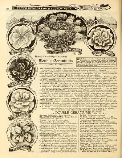 | Keywords: Everything for the garden (16828390046).jpg PETER HENI ERSON 8 CO l\EW YORK <br> 1 <br> I <br> mm <br> k'-'j-f <br> ri-r2 <br> Sfe; b - <br> p 7i; r <br> IRovelties anO Specialties in <br> 2 ouble Bevaniums <br> y <br> ill <br> – / ' <br> ' 'M <br> WE offer below and on the next page the finest collection of <br> Geraniums it is possible to get together at the present <br> time Going carefully over our fields during the season we <br> discarded everything that was not rst-class in every way pay- <br> ing particular attention to selecting strong-growing healthy <br> free-flowering and distinct sorts <br> ALPHONSE RICCARD Semi-double bright vermilion-scarlet; dwarf very vigorous large <br> trusses -4 to 71 inches in diameter ; florets 2 iiiciies in diameter See cut <br> C SAR Eed-solferino a brilliant and effective color Large trusses dwarf habit very free <br> COL BARRE Semi-double dwarf and very free ; lower petals rosy pink ; upper darker and <br> marked scarlet at the base Both floret and truss are of unusual size <br> COUNTESSE DE CASTRIES Clear pure deep pink bright and distinct ; fine truss splen- <br> did habit A splendid variety and should be in every collection ; sure to please See cut <br> LA FRAICHEUR Quite double pure snow-white distinct narrow Picotee edge of clear rosy <br> pink ; the effect is especially fresh and delightful; dwarf compact Price 35c each <br> M JULES DISPOT Largo flowers in very fine trusses rich violet-lake changing to crim- <br> son and shading to lilac at the centre violet and crimson in same truss Price 2 c each <br> MARQUISE DE CASTELLAINE A shapely dwarf grower with immense flowers about <br> 2' inches in diameter Two beautiful shades of red ; beautiful and distinct Price 35c each <br> MIsS FRANCES PERKINS A charming shade of bright pink fine large bloom and truss <br> vigorous habit profuse Jaloomer; clean healthy foliage; stands our climate splendidly <br> PASTEUR A most brilliant color bright orange-scarlet; truss large well-formed ; floret <br> lar je semi-double; habit dwarf ; exceptionally free in bloom Price 35c each <br> PROFUSION Rich warm salmon color Seedling from Beaute de Poitevine It is a grand <br> variety for bedding out in summer and equally valuable for pot plants iSVe cut <br> RENE BAZIN Fine truss on a long stiff stem ; very large and semi-double floret; white <br> rose and pink marbled together ; very free plant being covered with bloom Price 2oc each <br> RICHELIEU Fine large trusses of fiery scarlet flowerswith shadings of crimson and maroon; <br> dwarf ; foliage clean stands the sun well distinctly zoned See cut Price 35c each <br> S A NUTT Double brilliant deep crimson-scarlet ; compact rather tall vigorous grower; <br> heavy deep green foliage which does not b\irn ; large truss held well above the foliage <br> Price for the above except where specially priced ISc each 1 50 per dot <br> STANDARD <br> SORTS <br> Le Cid Brilliant crimson-red <br> M Caro Soft lilac-pink A good bedder <br> Mme Desbordes Valmore Large trusses <br> semi-double beautiful rose color <br> M de Galard Cherry-red shaded orange <br> Mad Turquin Noizet Plant free-blooming <br> a peculiar peachy-rose darker centre <br> Mme Dupont Flowers deep scarlet <br> Phalene Clear rose bordered dark rose <br> Pres Leon Picas Ruby red shaded violet <br> Robert Roland Gosselin Bright salmon <br> white spots; free-bloomer and giand truss <br> Roi des Negres Very dark glowing crimson <br> Ruy Bias Rich bright salmon <br> Silver Queen Clear pearly white <br> Sombre Horizon Very deep brilliant sal- <br> mon with vivid orange shadings <br> Theocrite White marked rose <br> Vera Vend Large orange-salmon centre <br> striped white marbled with rosy oi-ange <br> White Swan Pure white ; a grand variety <br> W P Simmons Clear orange-red ; fine habit <br> Price lOc each set of 31 varieties for 2 75 <br> DOUBLE GERANIUMS <br> Baron de Schleinitz Liglit salmon <br> BEAUTE DE POITEVINE Large flowers <br> brilliant salmon See cut <br> Bonnat A grand deep rosy pink <br> De Lacepede Beautiful light pink <br> Docteur Dujardin Beaumetz A free-flower- <br> ing variety with brilliant scarlet flowers <br> Double Gen Grant Intense orange-scarlet <br> very floriferous A grand bedding variety <br> Edw Daiaglede Large trusses beautiful ma- <br> genta base of upper petals mai-ked orange <br> Gloire de France Bright salmon <br> HEDWIGE BUCHNER A very fine double <br> white variety ; dwarf compact habit and ex- <br> cellent for pot culture or garden See cut <br> J J Harrison A grand semi-double scarlet <br> J B Varonne Carmine mixed with red <br> centre white streaked and striped lilac-rose <br> Jean Labor Red borders centre violet mixed <br> with lilac-mauve base of upperpetals orange <br> Jule» Claretie Rose lightly edged violet <br> white centre upper petals spotted white <br> La Fondre Deep scarlet crimson shadings 42383235 133997 66553 Page 146 Text http //www biodiversitylibrary org/page/42383235 1902 10 5962/bhl title 66553 Henry G Gilbert Nursery and Seed Trade Catalog Collection ; Peter Henderson Co Biodiversity Heritage Library Everything for the garden 1901 Garden Stories Catalogs Flowers Peter Henderson Co Plants Ornamental Seed industry and trade Seeds Trade catalogs U S Department of Agriculture National Agricultural Library bhl page 42383235 dc identifier http //biodiversitylibrary org/page/42383235 bhlGardenStories Double Gernaniums BHLinbloom peter henderson co plants ornamental u s department of agriculture national agricultural library bhlgardenstories double gernaniums bhlinbloom Information field Flickr posted date ISOdate 2015-03-18 Check categories 2015 August 24 CC-BY-2 0 BioDivLibrary https //flickr com/photos/61021753 N02/16828390046 2015-08-24 20 55 52 cc-by-2 0 PD-old-70-1923 Everything for the garden 1902 Photos uploaded from Flickr by Fæ using a script |